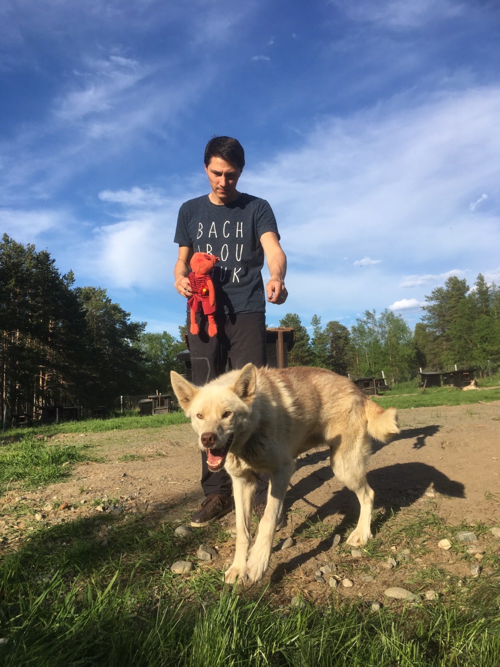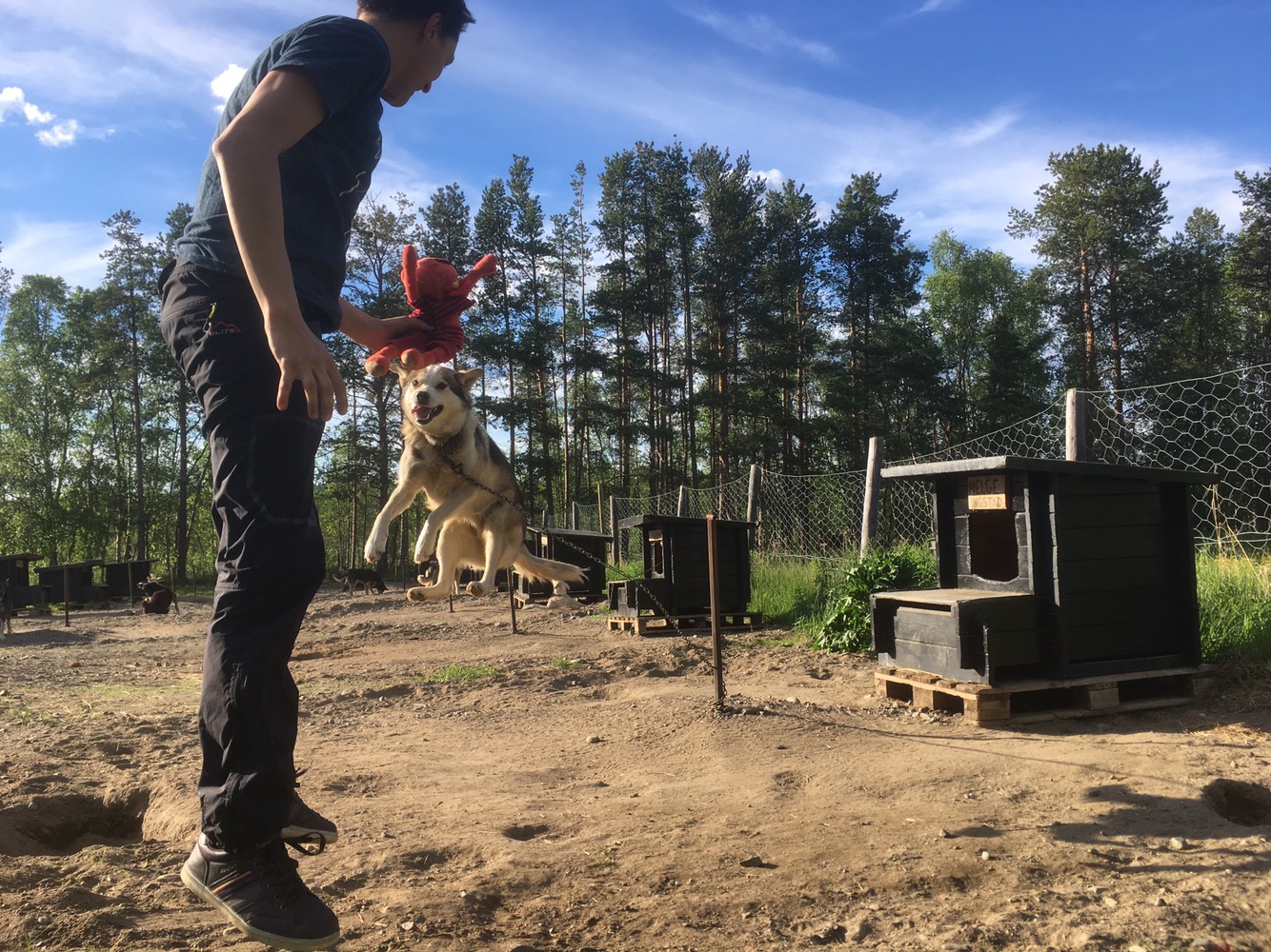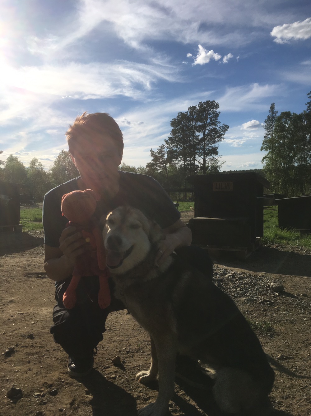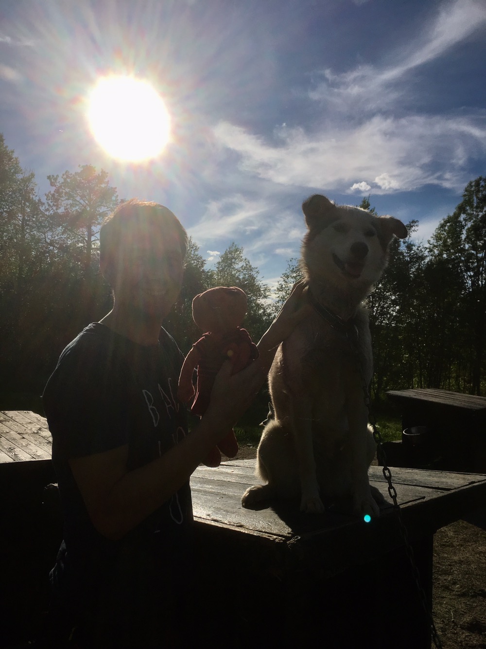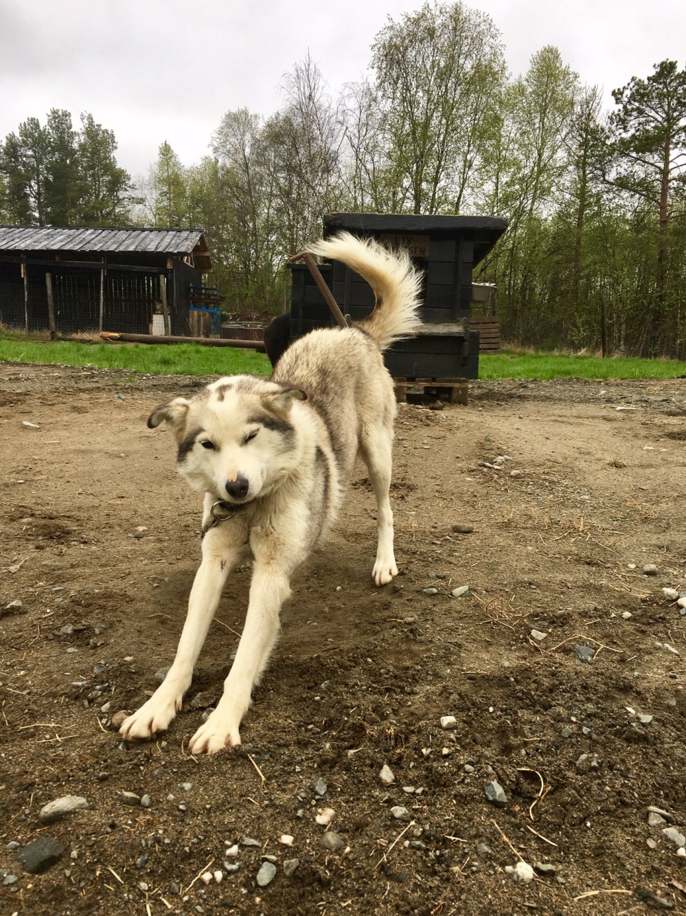 Stiggan ! Le chien loup ! Il a une tête de bad boy mais c’est un coeur tendre. Il joue les gros mâle mais il est castré depuis déjà plusieurs années et reste dans le camp des femelles dans le dogyard. On l’aime bien car il fait son dur mais nous on sait bien que c’est de la comédie !