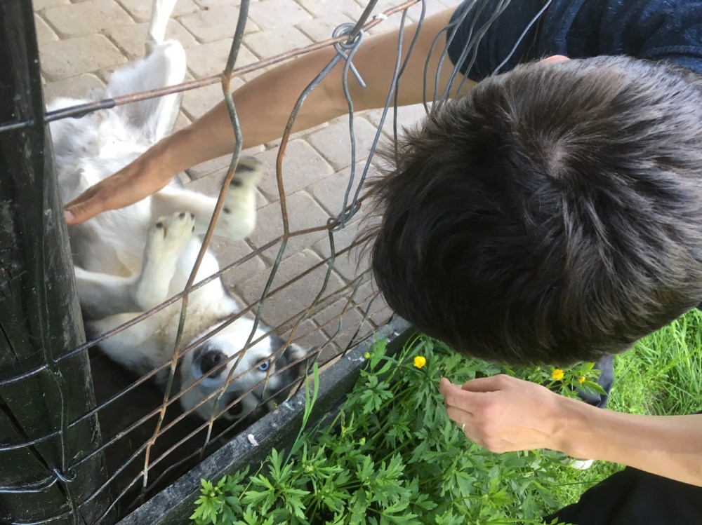 Salut Dina ! Alors elle, c’est une sacré coquine. Elle est si maligne qu’elle peut enlever son collier quand bon lui chante. Faut dire qu’elle a un cou aussi large que sa tête alors ça aide ! Du coup elle ne peut pas vivre dehors avec les autres chiens. Elle bénéficie donc d’une place privilégiée dans le puppy-yard normalement dédié aux puppies, comme son nom l’indique, et aussi aux chiens qu’on garde pour les vacances. C’est l’un des chiens qui tient le plus physiquement du husky sibérien. Pour rappel, tous les chiens ici sont des croisés entre huskies sibériens et chiens de chasse.
