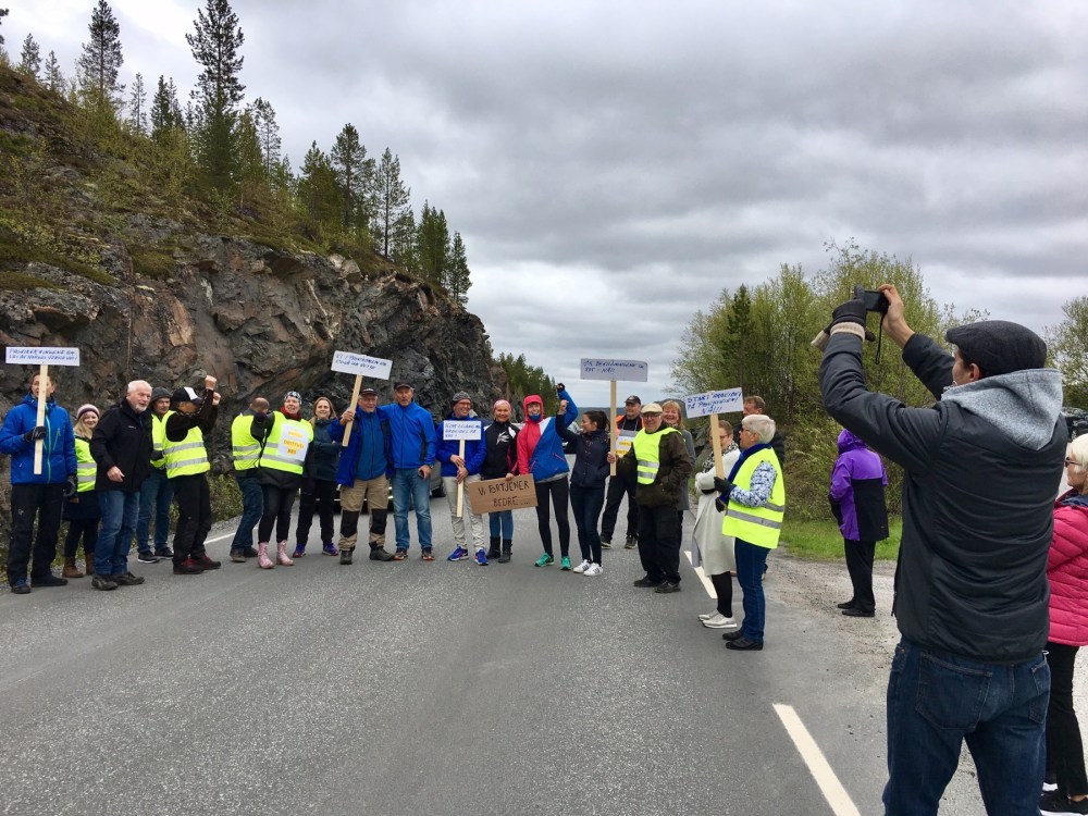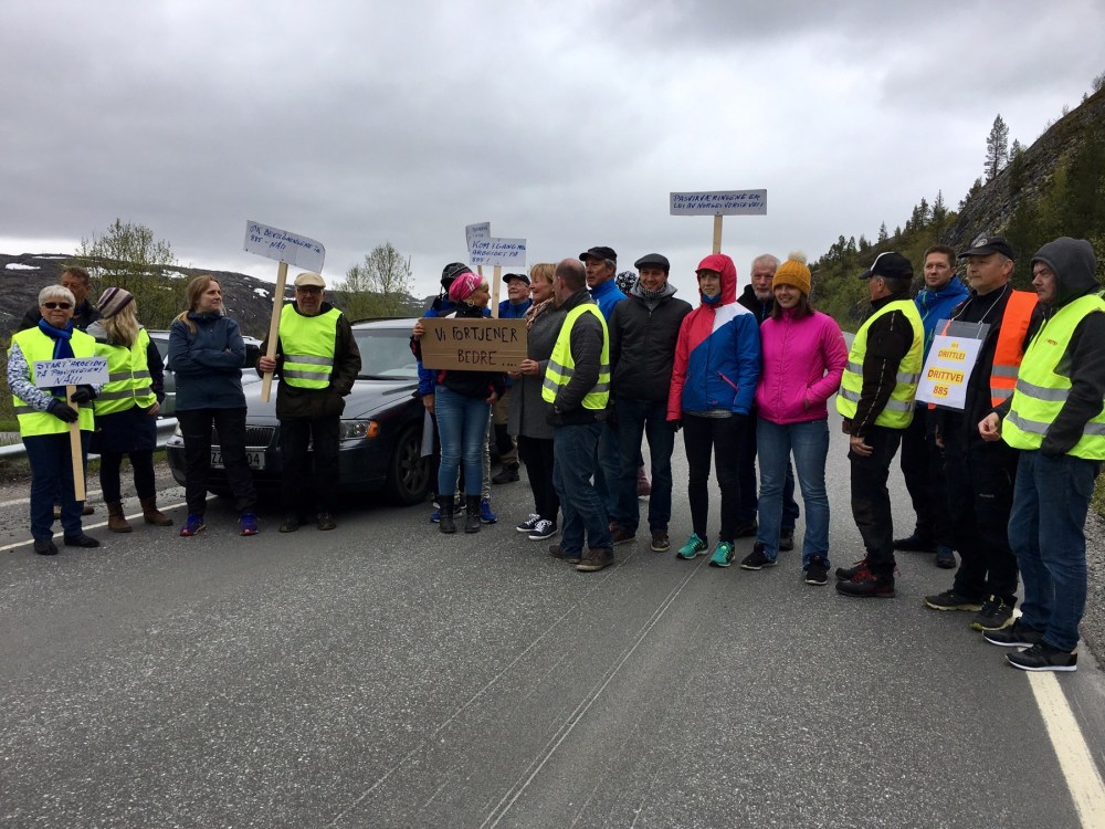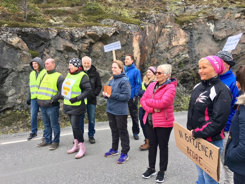 Trine, notre hôte, nous a demandé de l’accompagner pour soutenir la cause du coin : obtenir une meilleure route ! Bedre vei (meilleure route littéralement) ! Faut dire que c’était mieux d’arriver à 5 plutôt que toute seule pour compléter un groupe d’une vingtaine de personnes et… bloquer la route ! Du calme, du calme, on a dû bloquer 12 ou 13 voitures, tout au plus. On n’est pas en Bretagne ici !