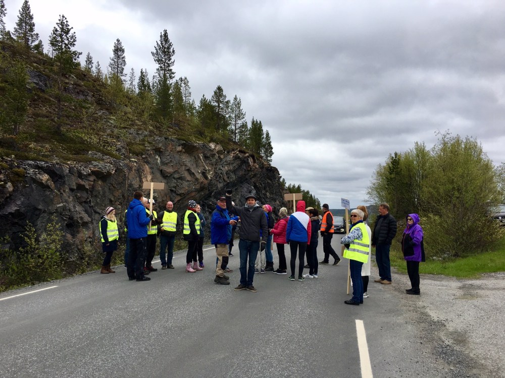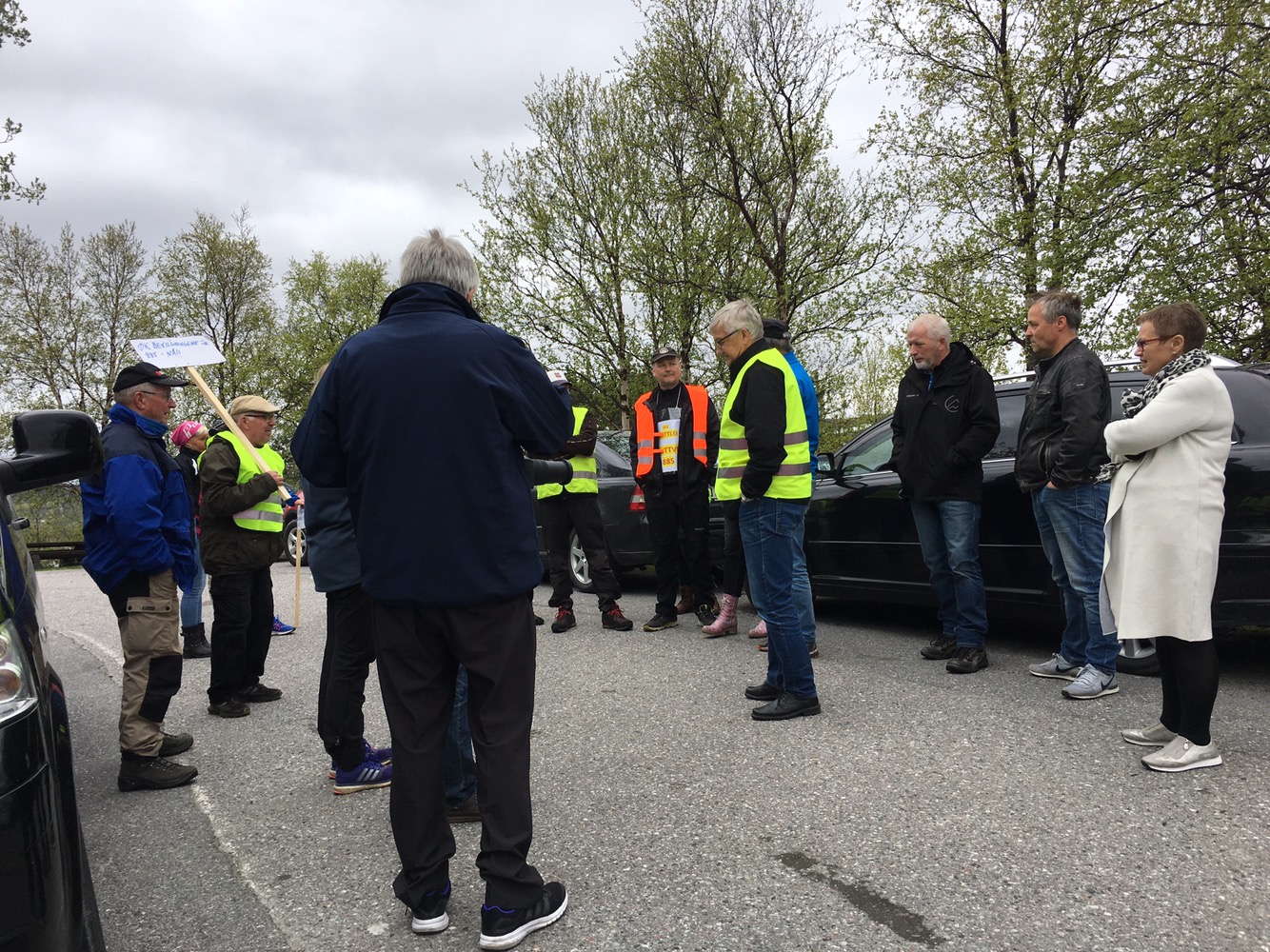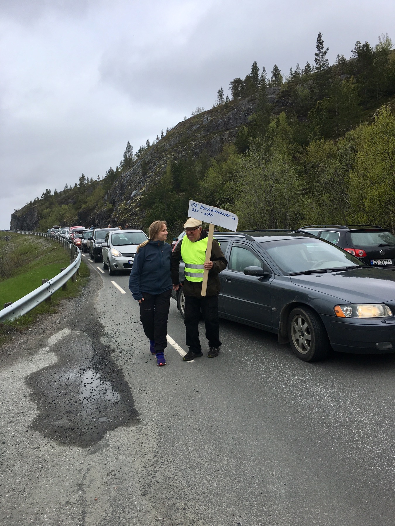 Trine, notre hôte, nous a demandé de l’accompagner pour soutenir la cause du coin : obtenir une meilleure route ! Bedre vei (meilleure route littéralement) ! Faut dire que c’était mieux d’arriver à 5 plutôt que toute seule pour compléter un groupe d’une vingtaine de personnes et… bloquer la route ! Du calme, du calme, on a dû bloquer 12 ou 13 voitures, tout au plus. On n’est pas en Bretagne ici !