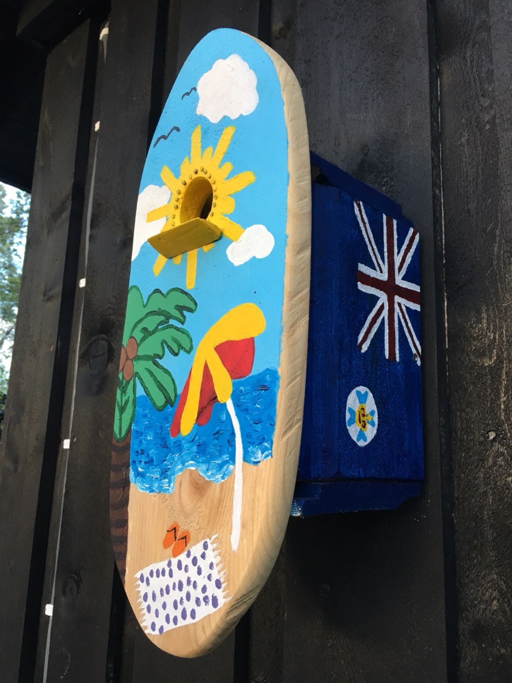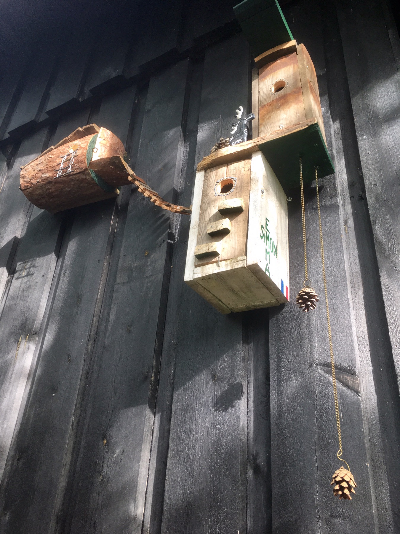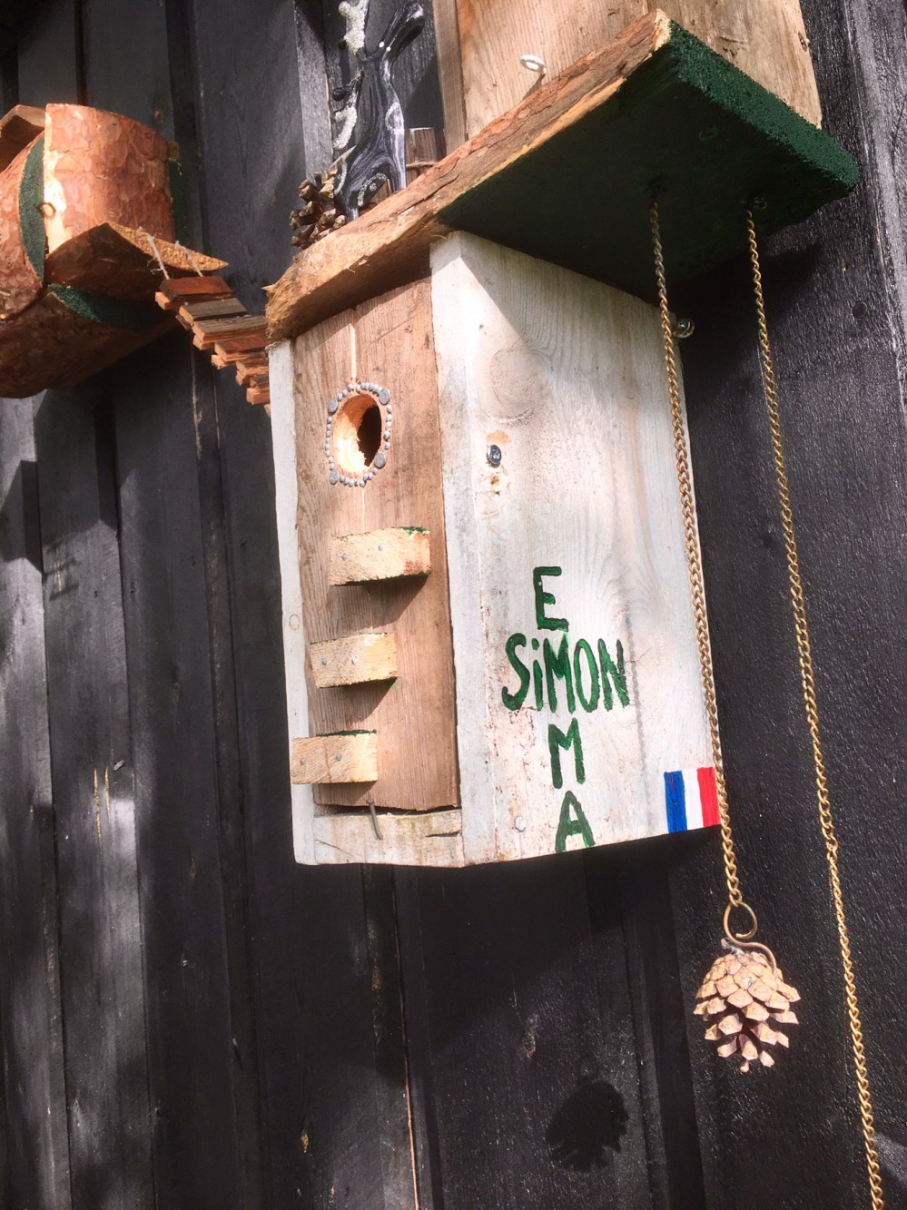 Le mur des birdhouses.La birdhouse de Marc, futur pilote pour Swissair.La birdhouse de Michelle, d’Australie.Nous avons donc commencé à travailler sur notre projet il y a deux semaines environ. Première séance de travail ci-dessus. On fait le gros oeuvre !Anne, notre amie volontaire allemande, profite d’une autre séance pour démarrer sa propre birdhouse et piquer quelques conseils à Simon ! Et voilà, on y est presque… Simon accroche notre création au mur…Je fignole la déco…Après plusieurs jours de recherche de matériaux et de travail, voici notre bébé : une triple birdhouse avec pont suspendu, bain norvégien, sapins et même un renne !Une petite échelle au cas où 🙂La terrasse spa avec bain norvégien.Des petites marches colorées…Un renne fier comme un pape !French signature!Happy us! Qu’en pensez vous ?