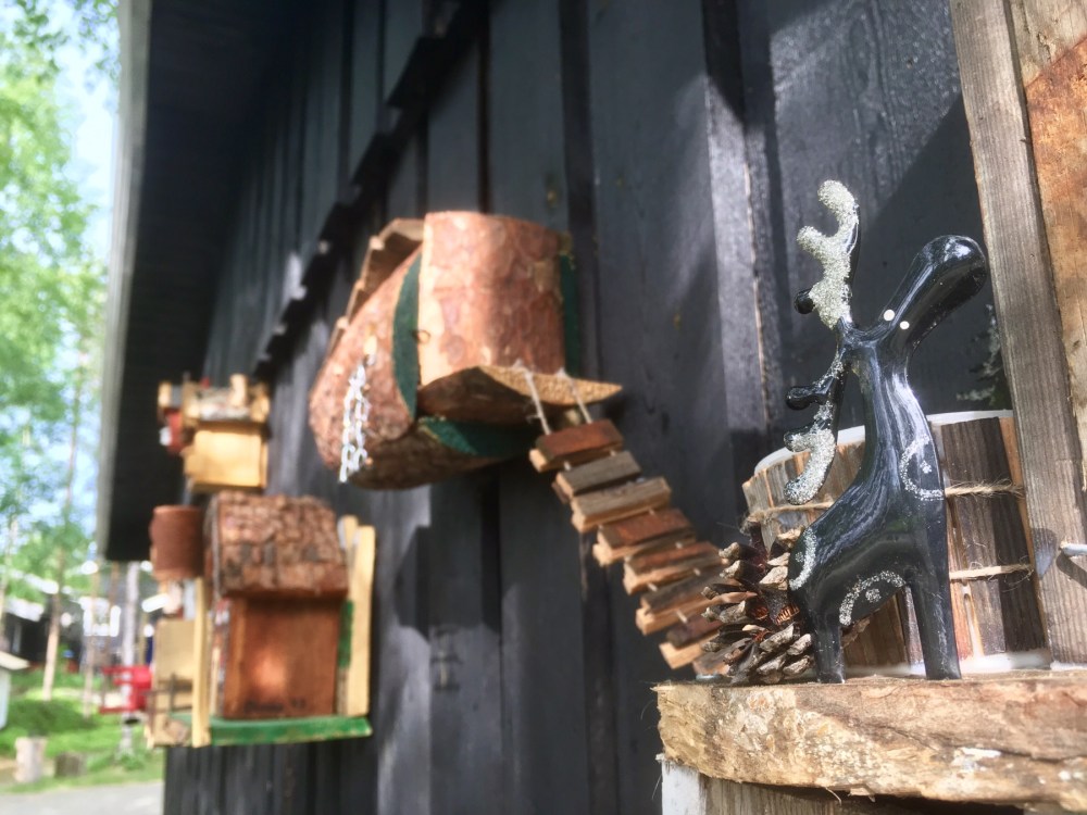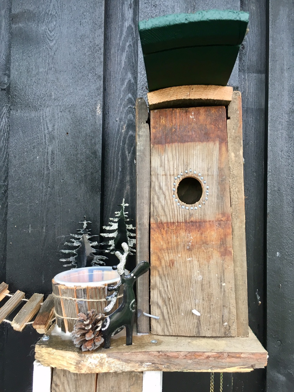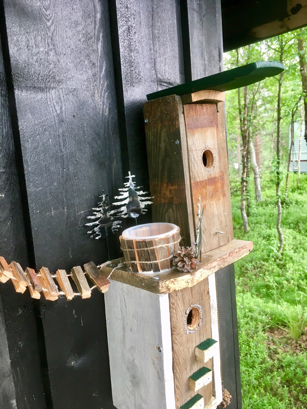 Le mur des birdhouses.La birdhouse de Marc, futur pilote pour Swissair.La birdhouse de Michelle, d’Australie.Nous avons donc commencé à travailler sur notre projet il y a deux semaines environ. Première séance de travail ci-dessus. On fait le gros oeuvre !Anne, notre amie volontaire allemande, profite d’une autre séance pour démarrer sa propre birdhouse et piquer quelques conseils à Simon ! Et voilà, on y est presque… Simon accroche notre création au mur…Je fignole la déco…Après plusieurs jours de recherche de matériaux et de travail, voici notre bébé : une triple birdhouse avec pont suspendu, bain norvégien, sapins et même un renne !Une petite échelle au cas où 🙂La terrasse spa avec bain norvégien.Des petites marches colorées…Un renne fier comme un pape !French signature!Happy us! Qu’en pensez vous ?