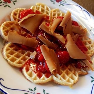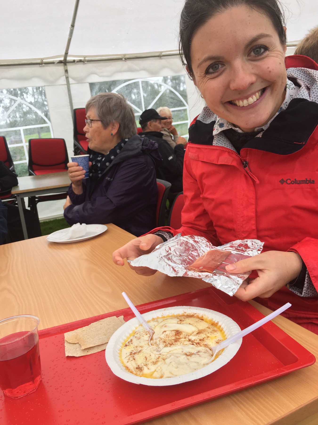– une gaufre garnie de crème, de confiture de fraise et de brunost, fromage à pâte brune caramélisé au goût sucré, véritable aliment de référence en Norvège. A déguster sur du pain, une tranche de WASA ou une gaufre car seul, on ne peut pas vraiment dire que ce soit bon. On est tous devenus accros ici, à BIRK, et on en mange tous les jours. Nos hôtes sont surpris car rares sont les étrangers qui apprécient le brunost. C’est peut être notre façon à nous de nous consoler de ne pas pouvoir consommer de « vrais fromages »…