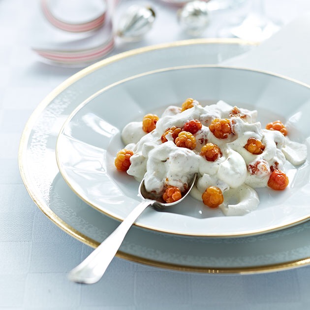 Passons au sucré avec le multekrem, dessert composé de mûres arctiques et de crème fouettée (vous l’aurez compris, les Norvégiens adorent la crème !). Les cloudberries, comme on les appelle ici, sont de petites framboises sauvages jaune oranger également appelées plaquebières ou mûres de marais. Nous les récoltons actuellement, par milliers, à la main, et les congelons afin de pouvoir les servir en dessert jusqu’à l’année prochaine.