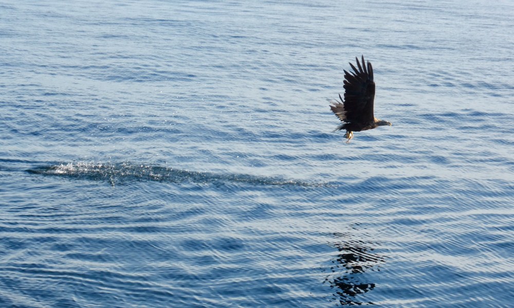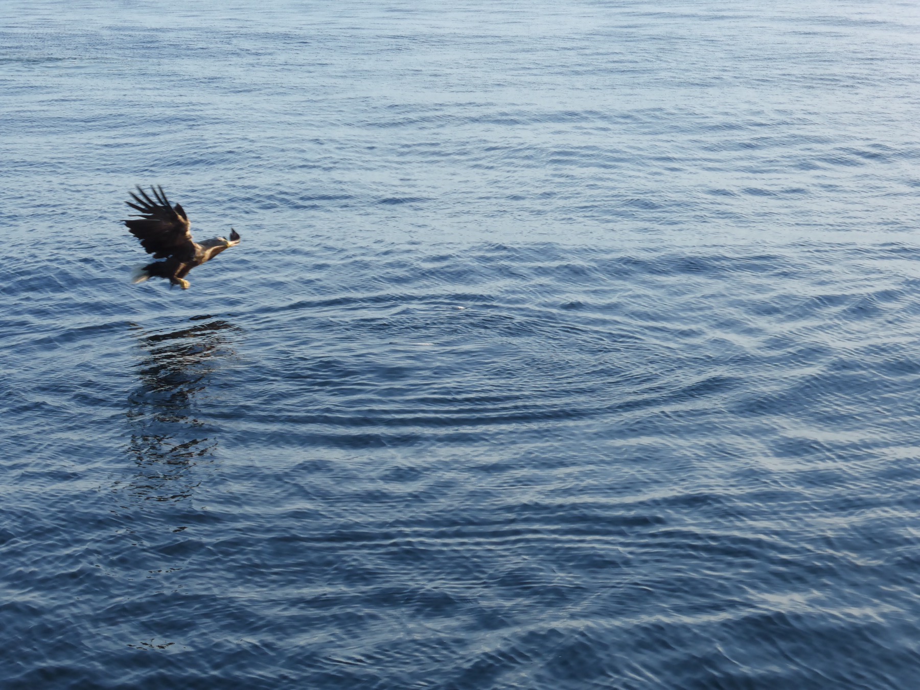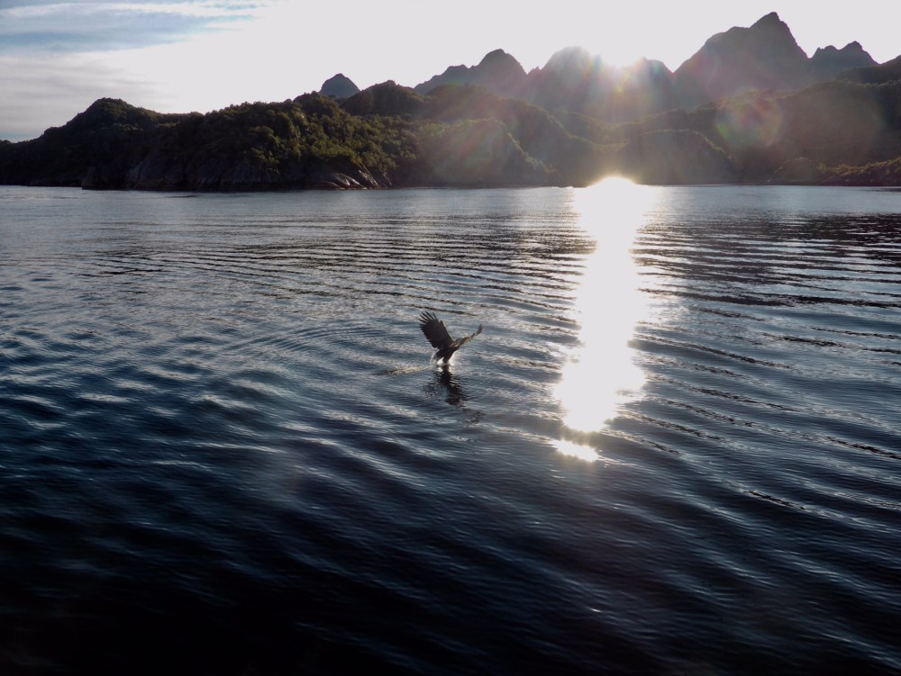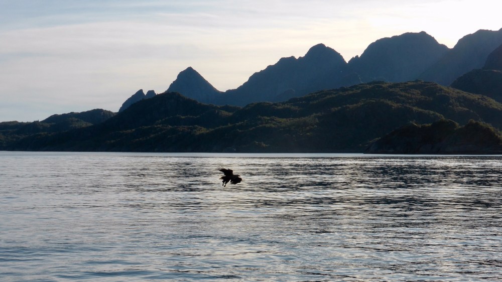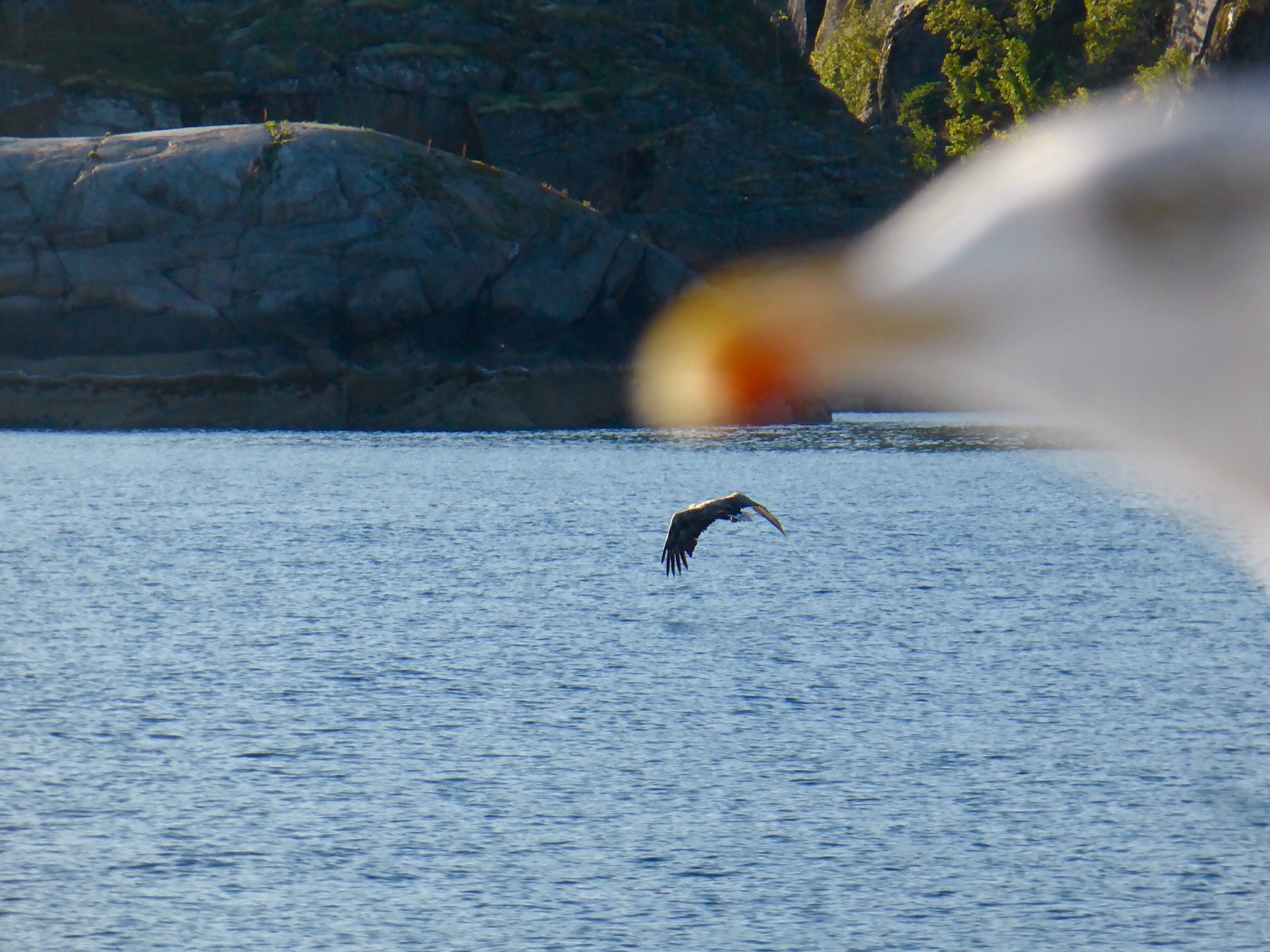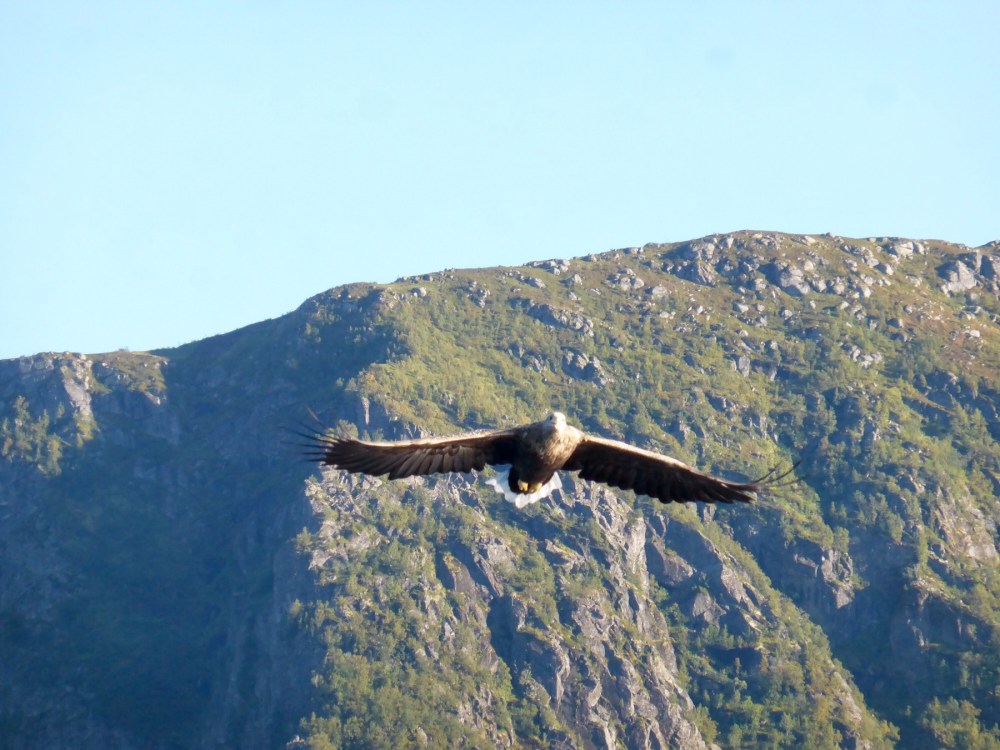 Le pygargue tant recherché se montrera finalement le jour de notre départ. Trine nous dépose de bonne heure ce jour là au bateau et nous avons 3 heures devant nous. Je prends place avec Emma sur une grosse roche à proximité du ferry et regarde sans but précis l’horizon et les alentours du port de Kirkenes. Des flans de verdure en pente douce se jettent dans la mer et il est là. Tournoyant dans les airs. Je sors les jumelles. Il est loin mais seul et majestueux. Les photos ne sont pas possibles mais je l’ai VU ! Rendez-vous plus tard dans le Trollfjord où nous avons planifié une excursion en bateau. La zone est réputée pour les pygargues à queue blanche, je serai donc au rendez-vous avec mon appareil !