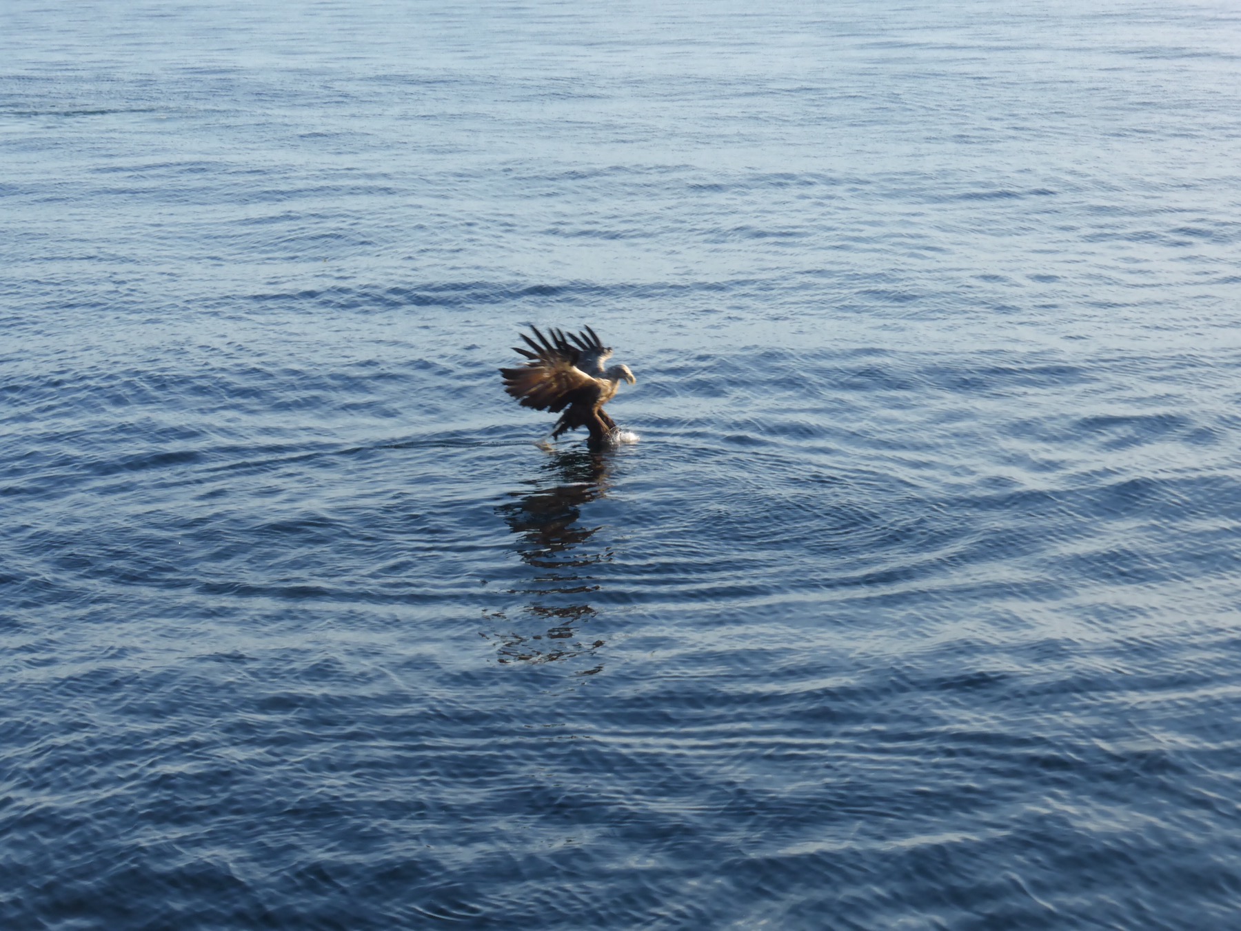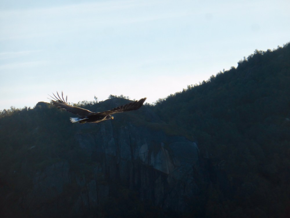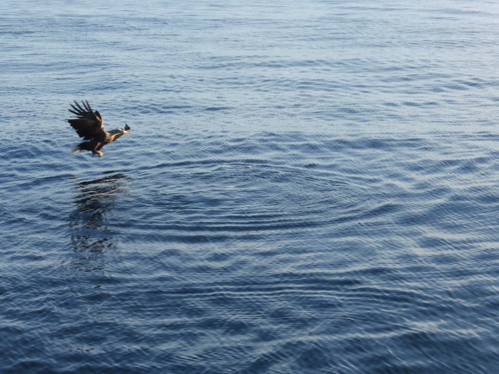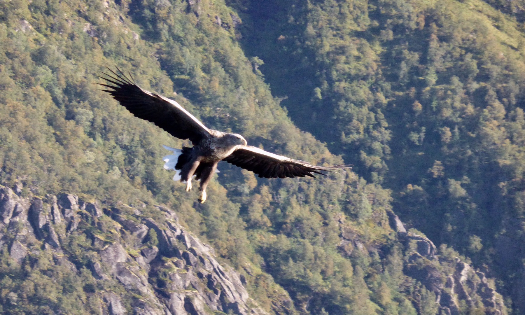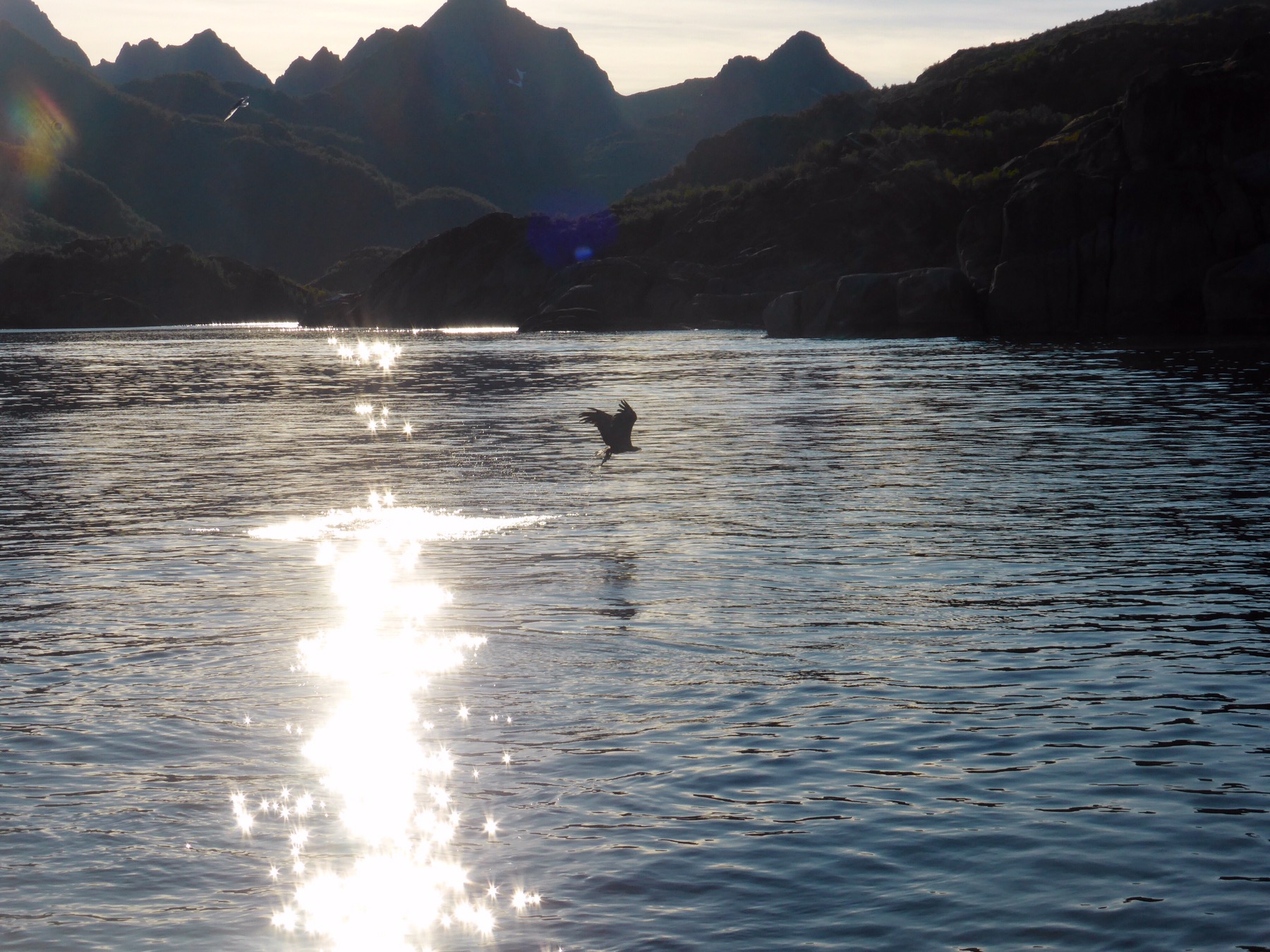 Le pygargue tant recherché se montrera finalement le jour de notre départ. Trine nous dépose de bonne heure ce jour là au bateau et nous avons 3 heures devant nous. Je prends place avec Emma sur une grosse roche à proximité du ferry et regarde sans but précis l’horizon et les alentours du port de Kirkenes. Des flans de verdure en pente douce se jettent dans la mer et il est là. Tournoyant dans les airs. Je sors les jumelles. Il est loin mais seul et majestueux. Les photos ne sont pas possibles mais je l’ai VU ! Rendez-vous plus tard dans le Trollfjord où nous avons planifié une excursion en bateau. La zone est réputée pour les pygargues à queue blanche, je serai donc au rendez-vous avec mon appareil !