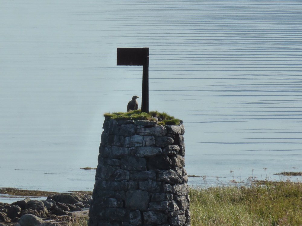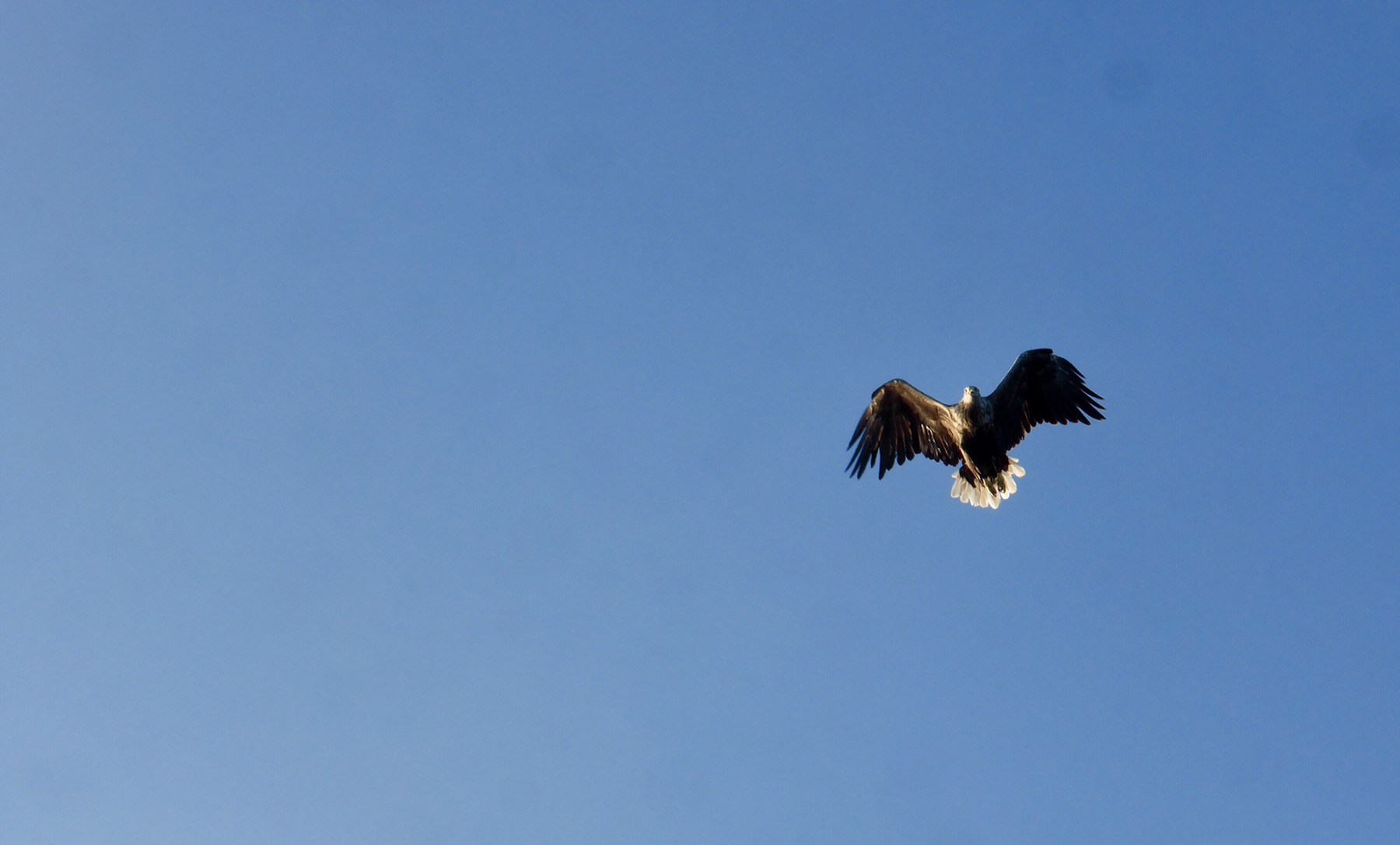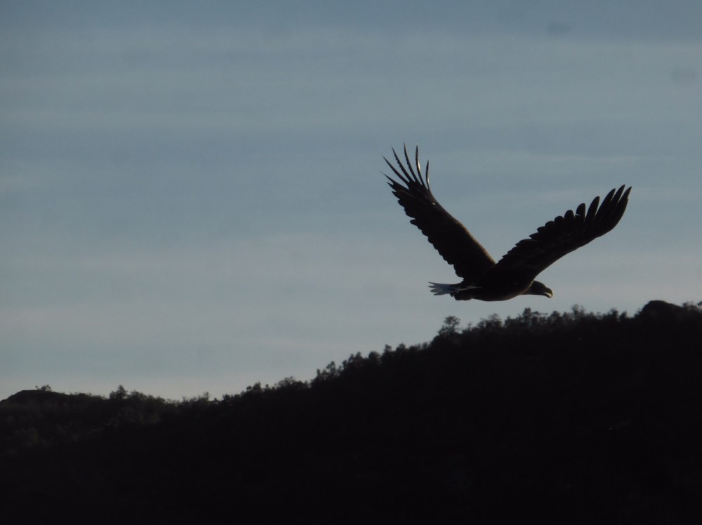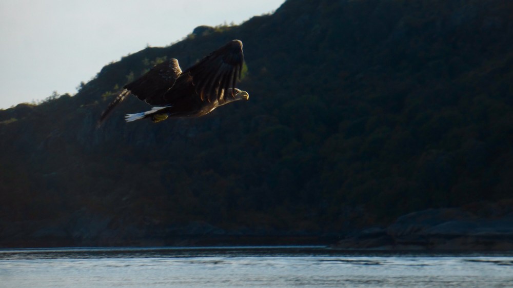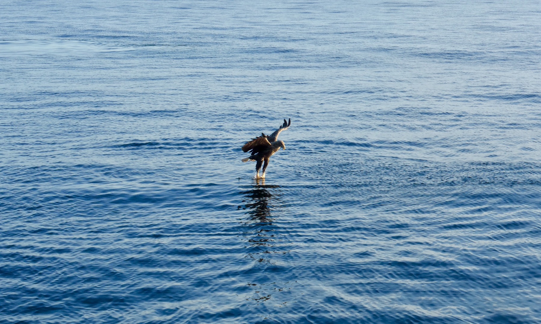 Le pygargue tant recherché se montrera finalement le jour de notre départ. Trine nous dépose de bonne heure ce jour là au bateau et nous avons 3 heures devant nous. Je prends place avec Emma sur une grosse roche à proximité du ferry et regarde sans but précis l’horizon et les alentours du port de Kirkenes. Des flans de verdure en pente douce se jettent dans la mer et il est là. Tournoyant dans les airs. Je sors les jumelles. Il est loin mais seul et majestueux. Les photos ne sont pas possibles mais je l’ai VU ! Rendez-vous plus tard dans le Trollfjord où nous avons planifié une excursion en bateau. La zone est réputée pour les pygargues à queue blanche, je serai donc au rendez-vous avec mon appareil !