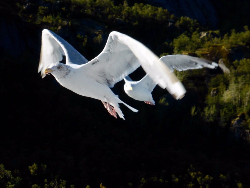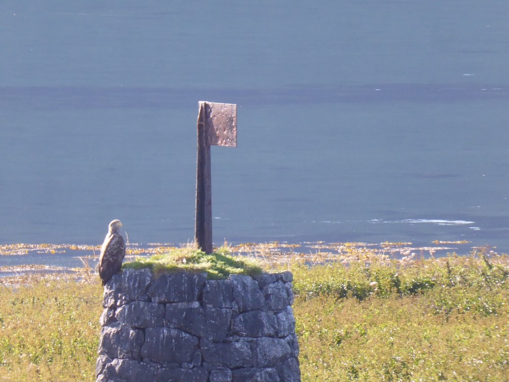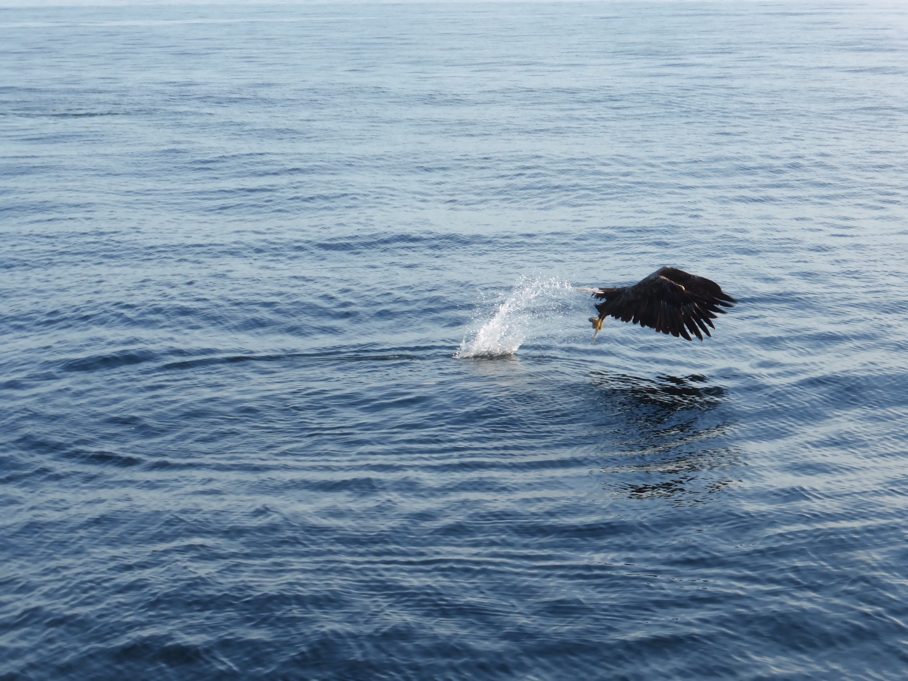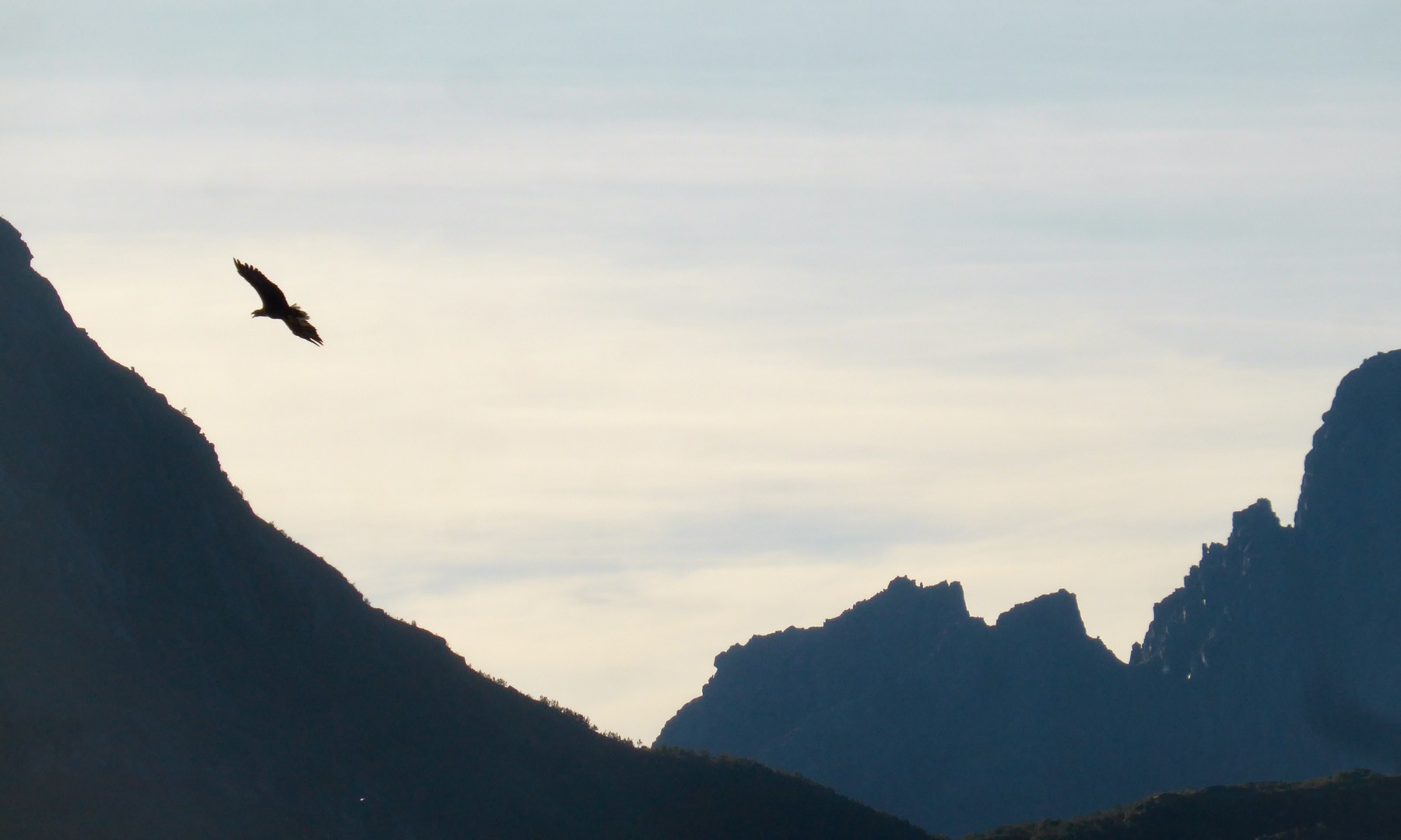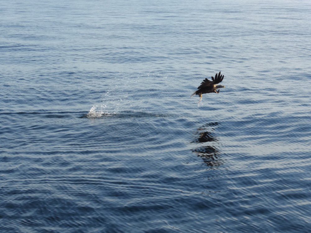 Le pygargue tant recherché se montrera finalement le jour de notre départ. Trine nous dépose de bonne heure ce jour là au bateau et nous avons 3 heures devant nous. Je prends place avec Emma sur une grosse roche à proximité du ferry et regarde sans but précis l’horizon et les alentours du port de Kirkenes. Des flans de verdure en pente douce se jettent dans la mer et il est là. Tournoyant dans les airs. Je sors les jumelles. Il est loin mais seul et majestueux. Les photos ne sont pas possibles mais je l’ai VU ! Rendez-vous plus tard dans le Trollfjord où nous avons planifié une excursion en bateau. La zone est réputée pour les pygargues à queue blanche, je serai donc au rendez-vous avec mon appareil !