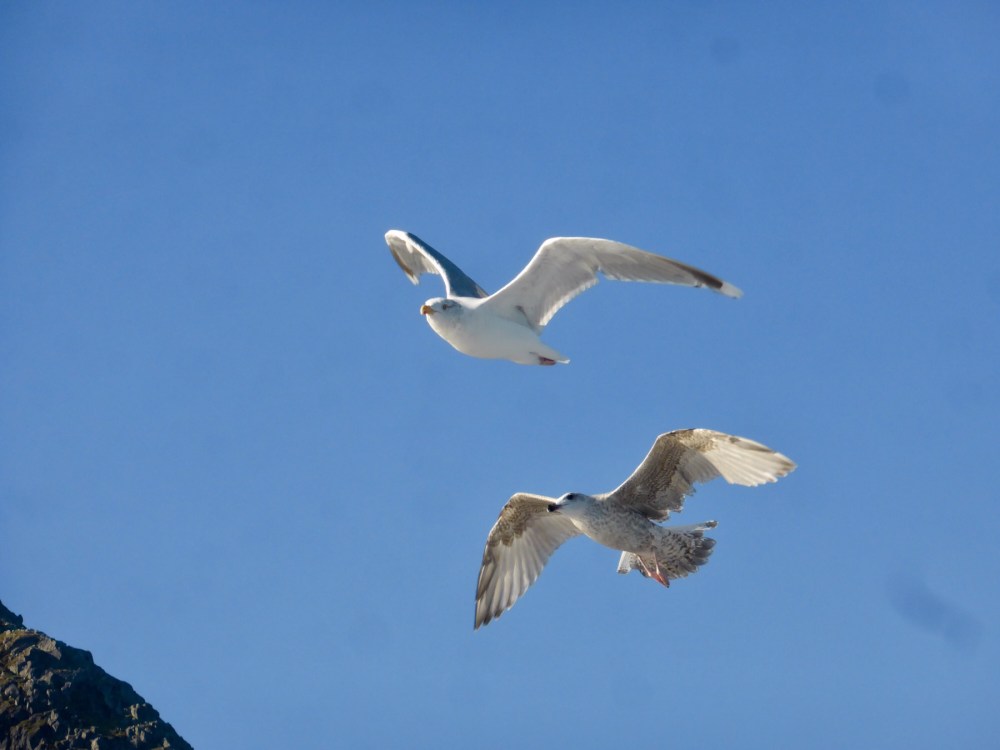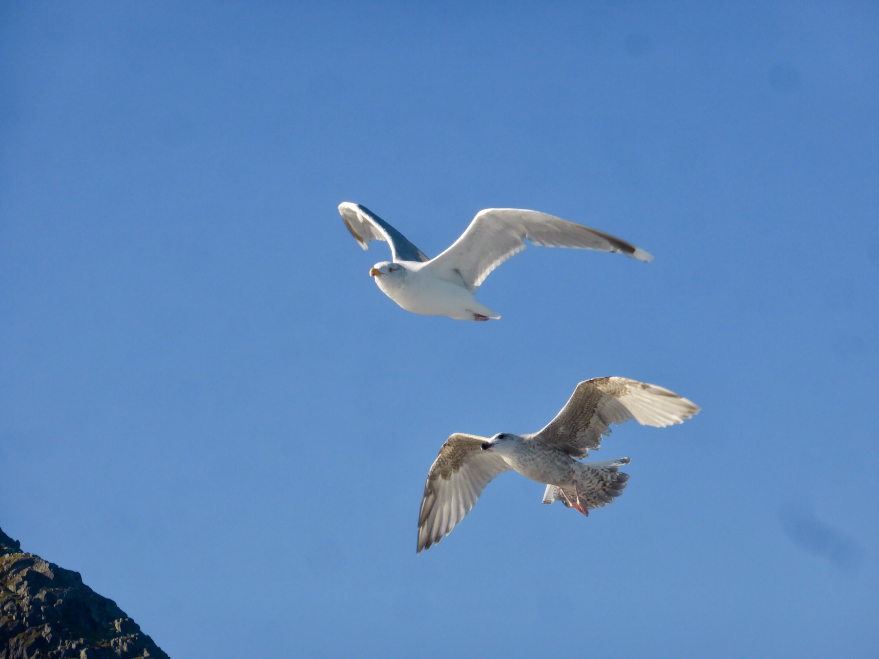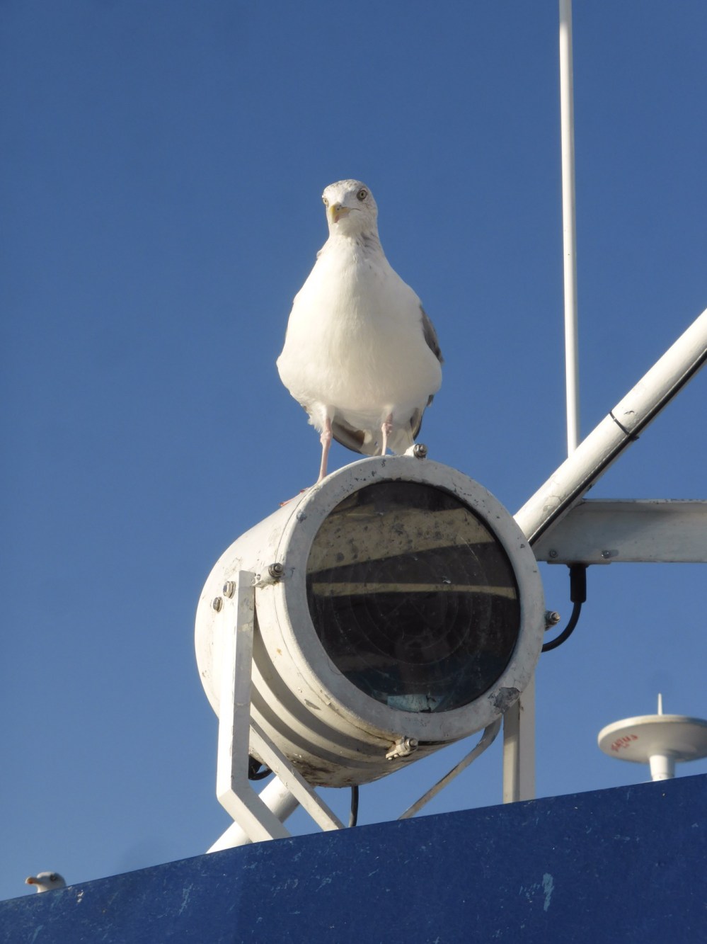 Nous commençons la navigation en la compagnie de goélands argentés, jeunes et adultes.
