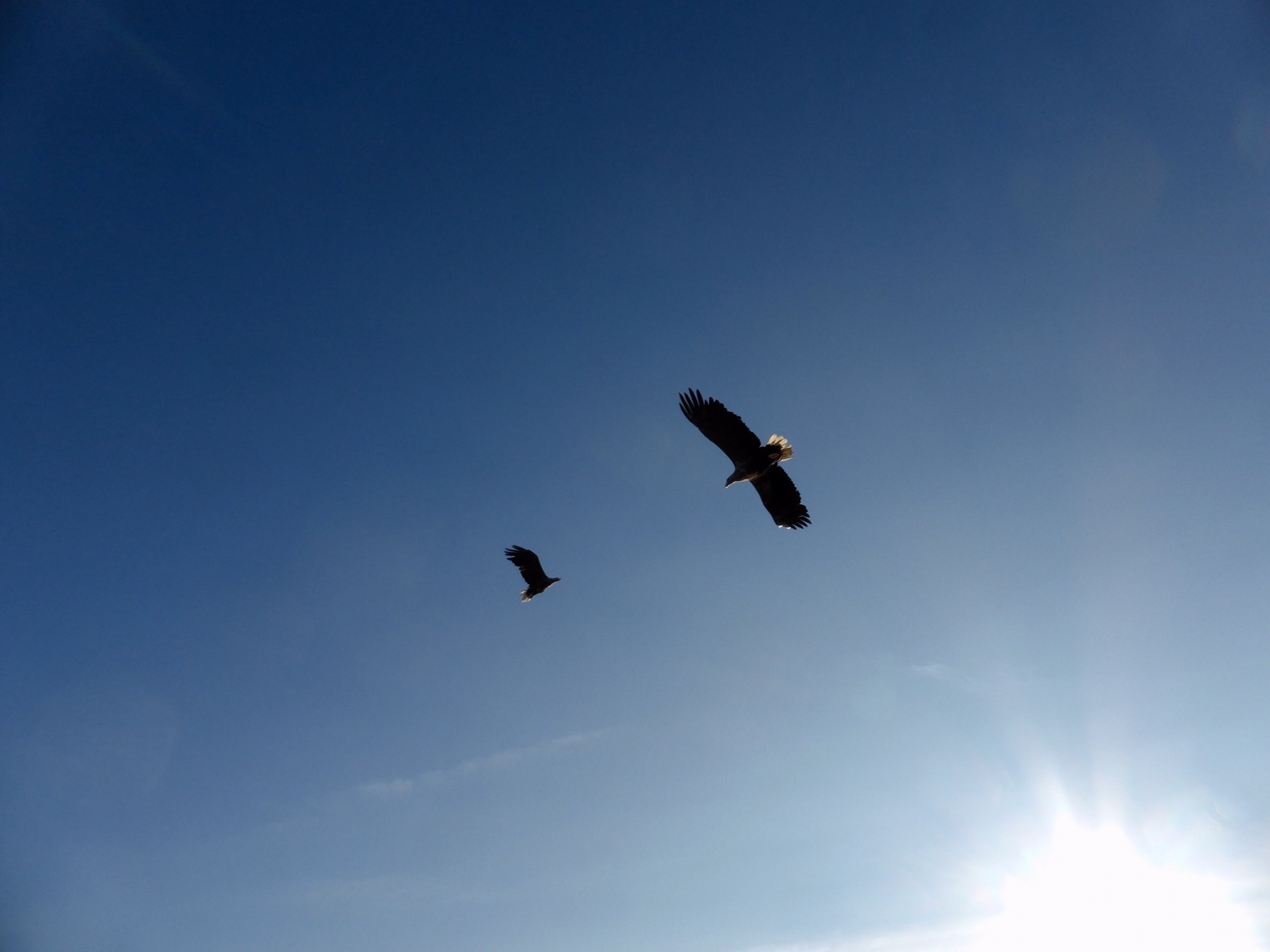 Le jour suivant, comme à l’accoutumée, je déjeune les yeux dans le vague, les petits oiseaux sont activement occupés à la mangeoire et les écureuils exercent leur va et vient habituel quand tout à coup, l’un d’entre eux stoppe sa course et détale en marche arrière comme une brindille soufflée par le vent. Étrange comportement car les écureuils ici ne sont pas farouches, et de plus tout est calme, pas de voiture, pas d’humain. Bref, je mords de nouveau dans ma tartine, et là, débarquant de nulle part et rapide comme la foudre, un aigle s’abat sur le sol juste devant moi et à quelques centimètres des fesses de l’écureuil ! Incroyable moment, malheureusement pour le blog, nous étions le matin donc pas d’appareil photo. Vérification faite avec notre hôte, il s’agissait d’un aigle royal. Sa longueur est de 77 à 90 cm et l’envergure de 1,90 à 2,10 m : du sérieux !