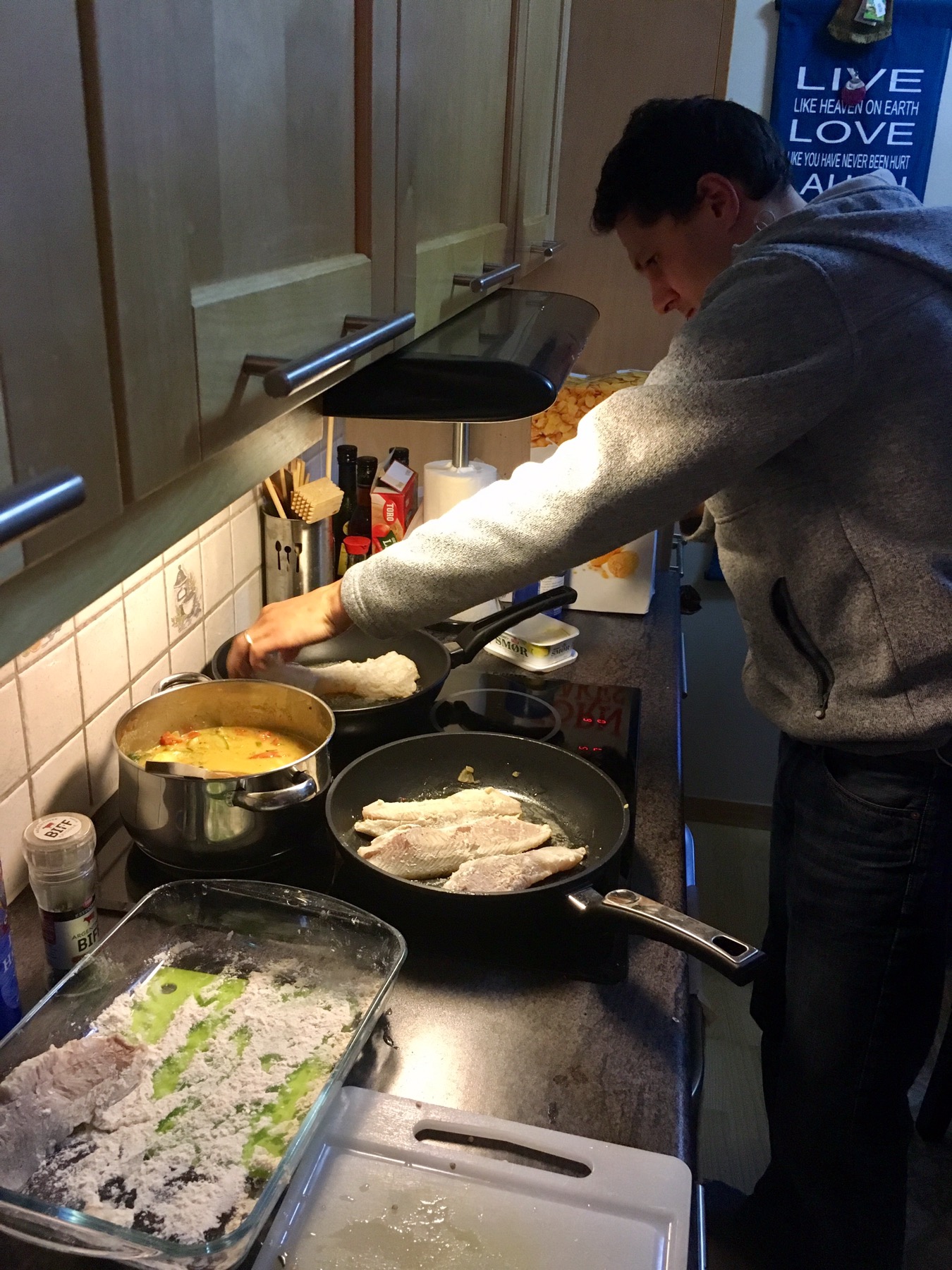 Le temps est venu de déguster nos belles prises du jour ! Simon prend soin de faire revenir les filets de lieu noir et de cabillaud qui accompagneront mon curry de légumes.