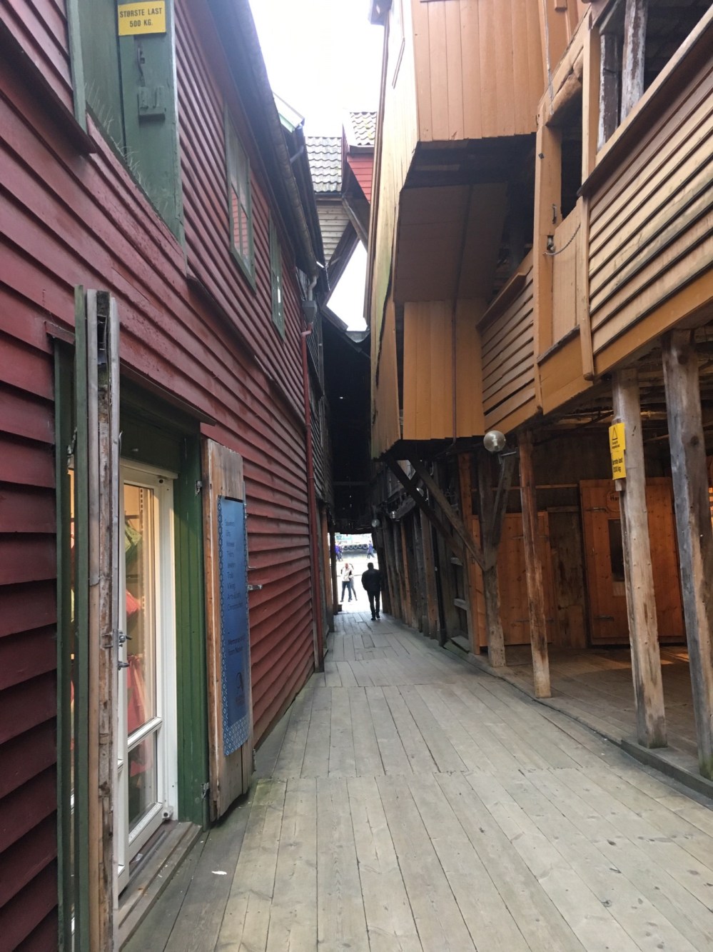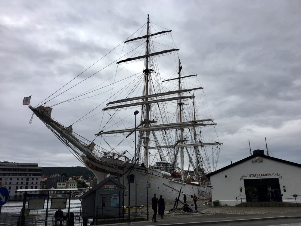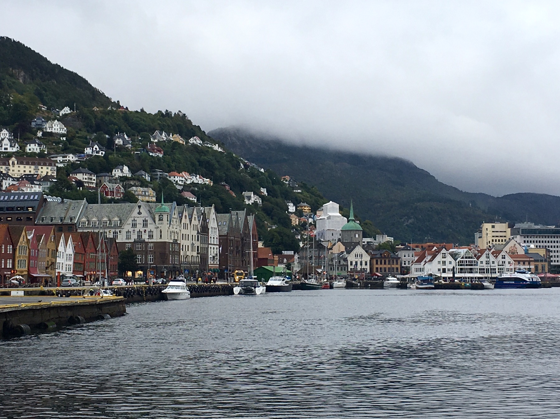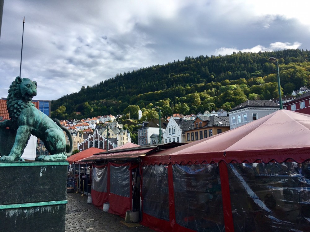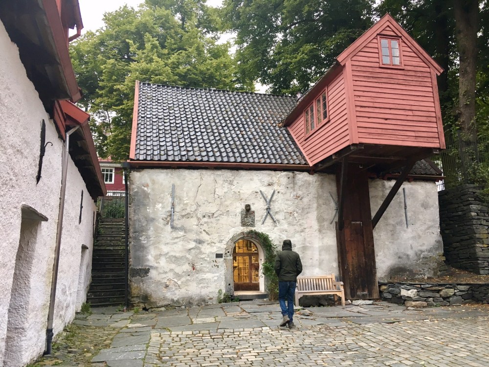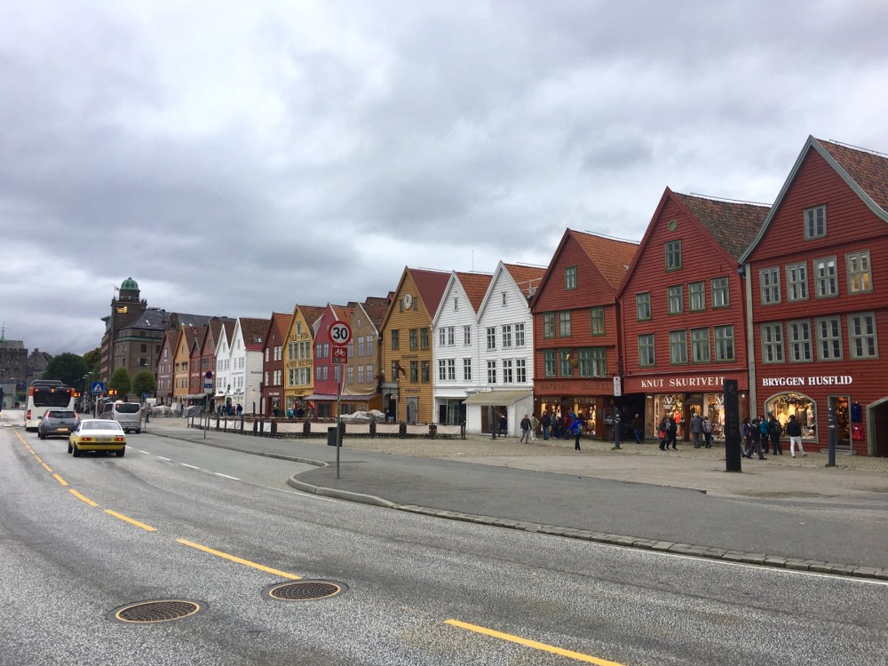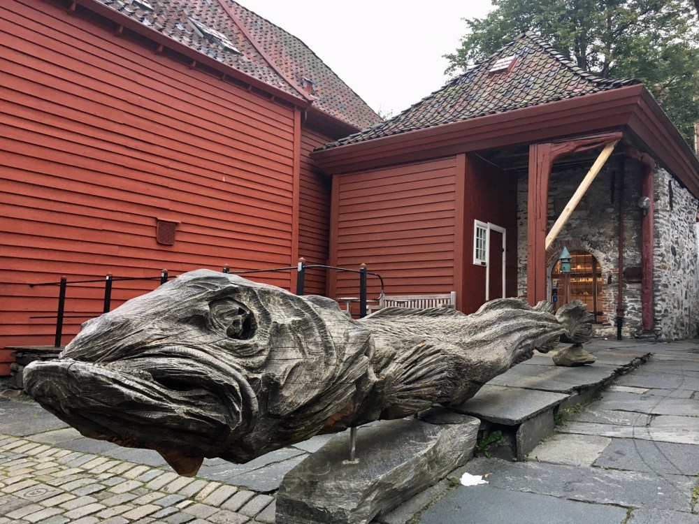Nous arrivons au port et apercevons de l’autre côté du quai les célèbres maisons de Bryggen. Tout ce quartier a brûlé à de nombreuses reprises notamment en 1476, en 1702 et aussi en 1955. A la suite de ce dernier incendie, la soixantaine de maisons subsistantes fut restaurée dans un style proche du plan médiéval original. Tout le quai est ainsi bordé de hautes maisons en bois, serrées les unes contre les autres, ne laissant que d’étroits passages entre elles. Ces superbes bâtisses à pignons constituaient les entrepôts et les logements des célèbres marchands de la Hanse dont je reparlerai plus tard. Tout ça pour dire que Bryggen est inscrit au Patrimoine mondial de l’Unesco depuis 1979 et on comprend pourquoi !