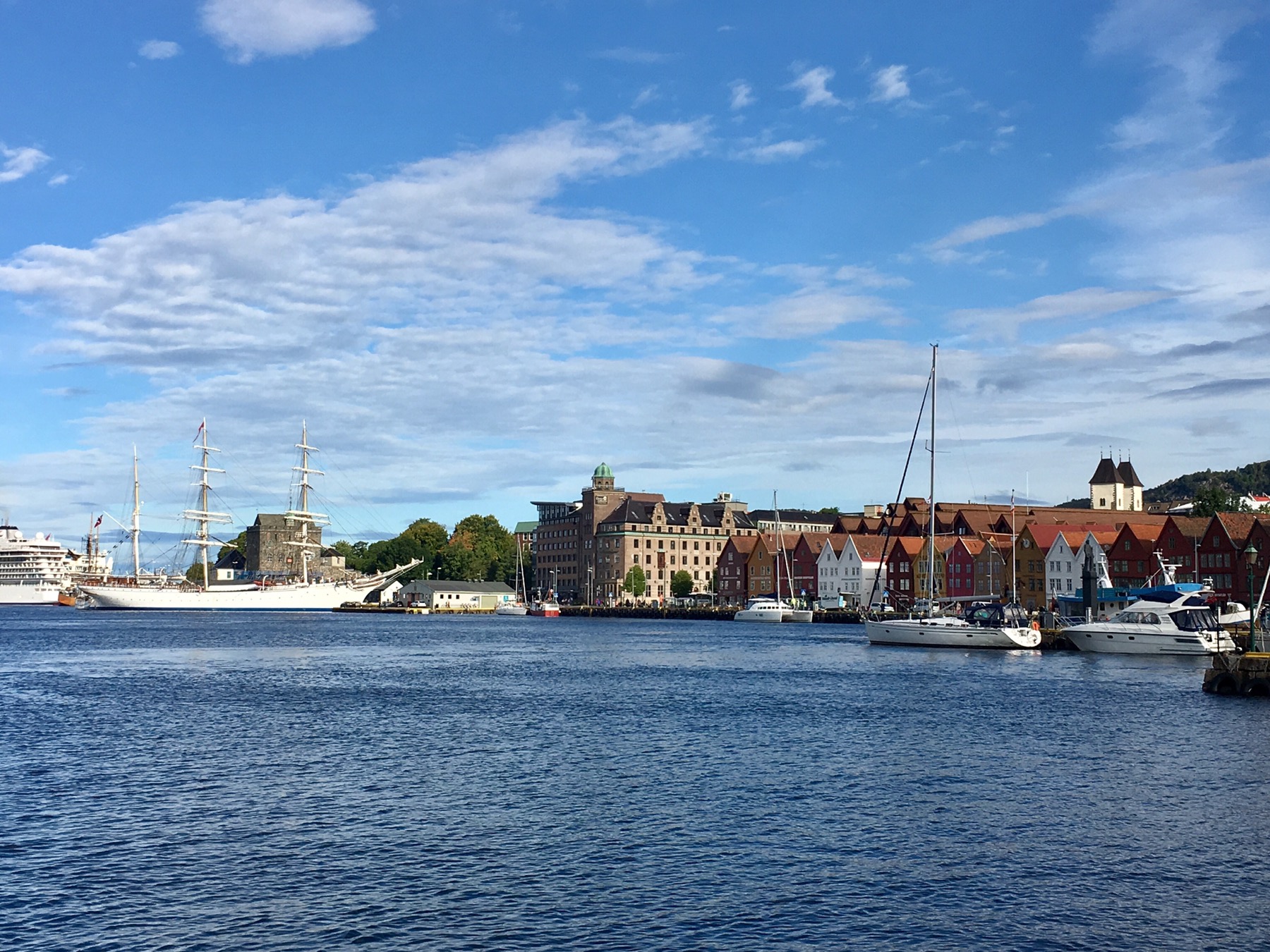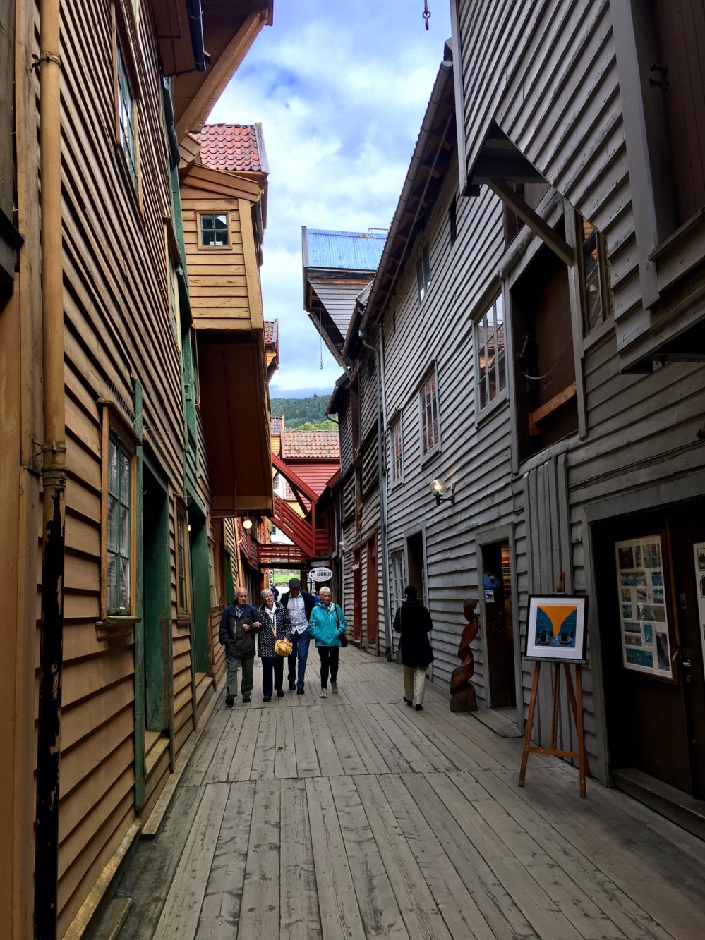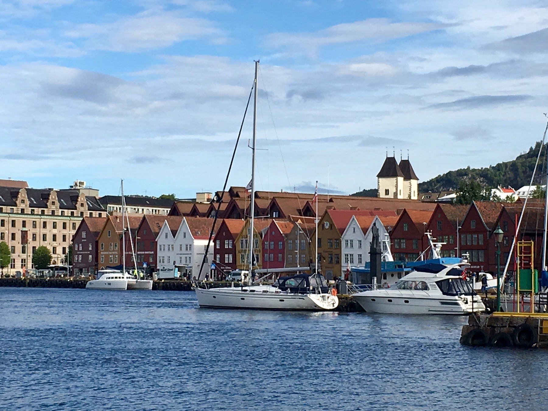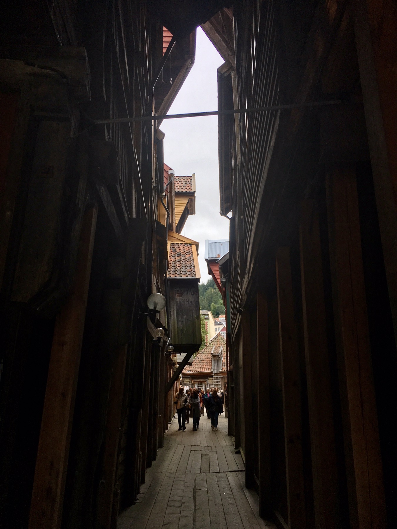 Nous arrivons au port et apercevons de l’autre côté du quai les célèbres maisons de Bryggen. Tout ce quartier a brûlé à de nombreuses reprises notamment en 1476, en 1702 et aussi en 1955. A la suite de ce dernier incendie, la soixantaine de maisons subsistantes fut restaurée dans un style proche du plan médiéval original. Tout le quai est ainsi bordé de hautes maisons en bois, serrées les unes contre les autres, ne laissant que d’étroits passages entre elles. Ces superbes bâtisses à pignons constituaient les entrepôts et les logements des célèbres marchands de la Hanse dont je reparlerai plus tard. Tout ça pour dire que Bryggen est inscrit au Patrimoine mondial de l’Unesco depuis 1979 et on comprend pourquoi !