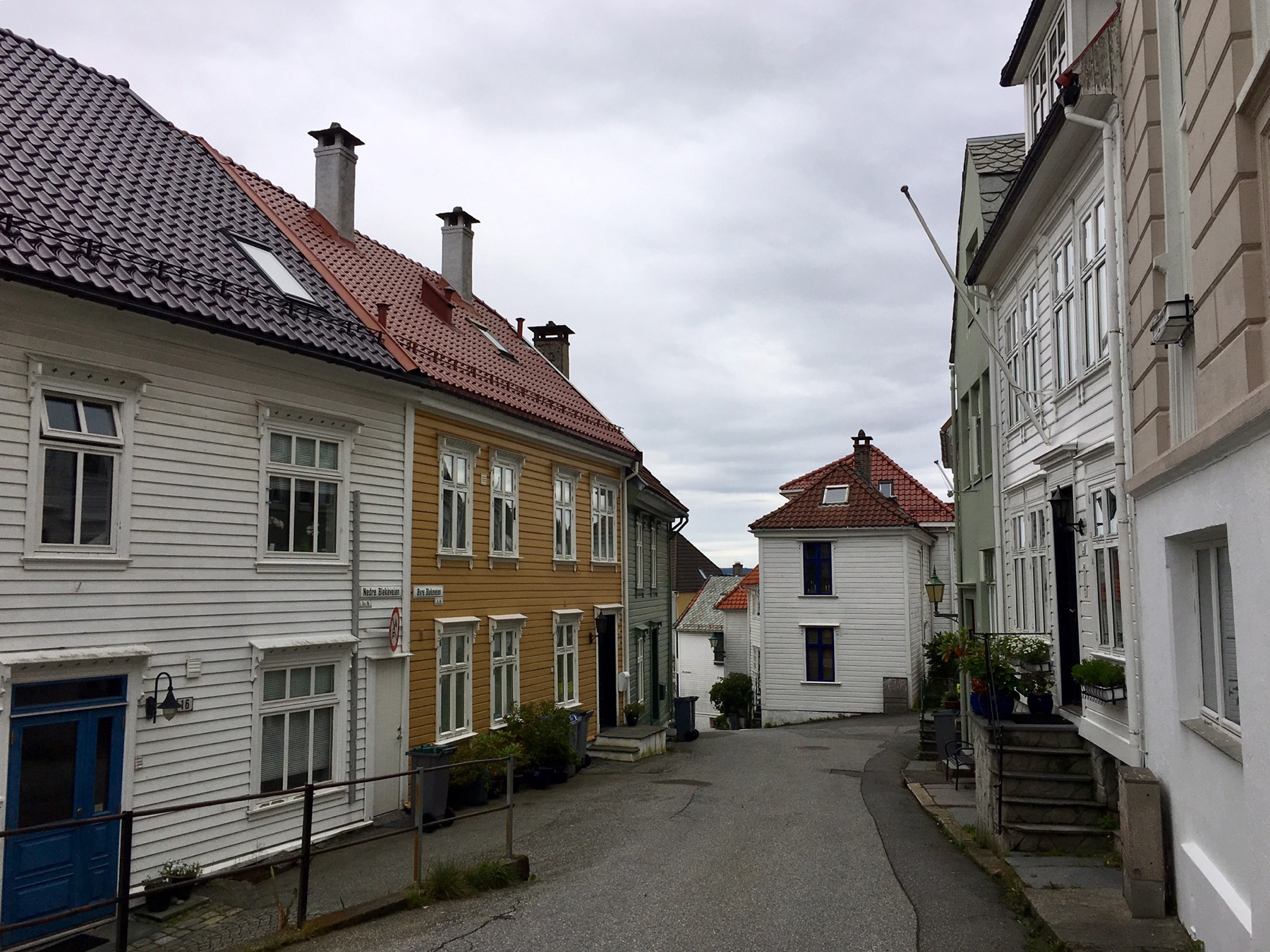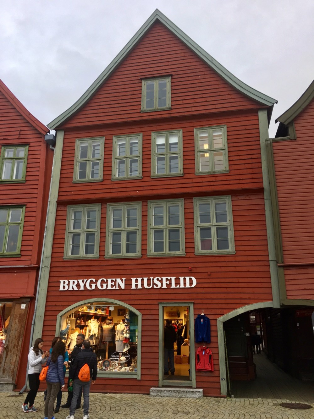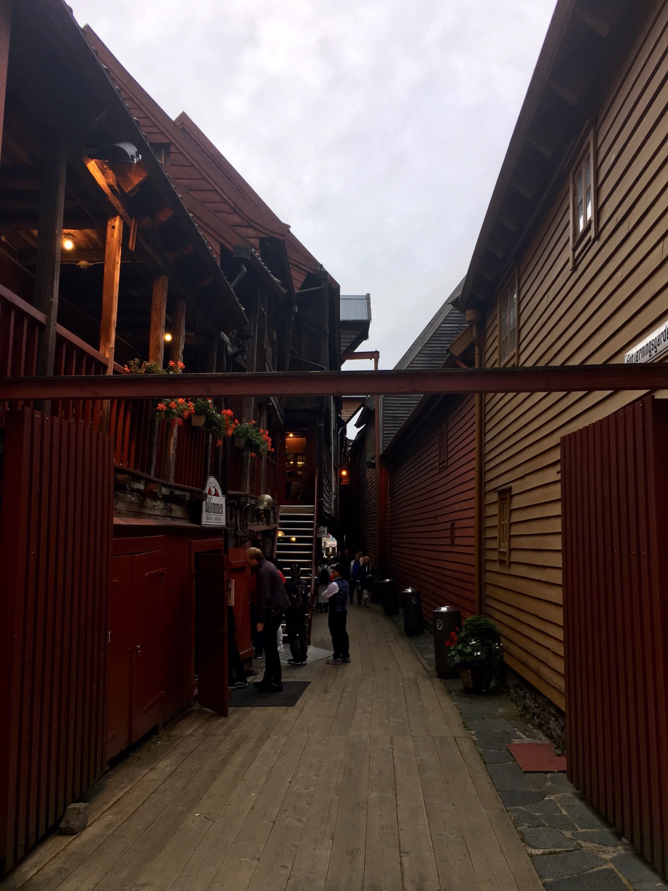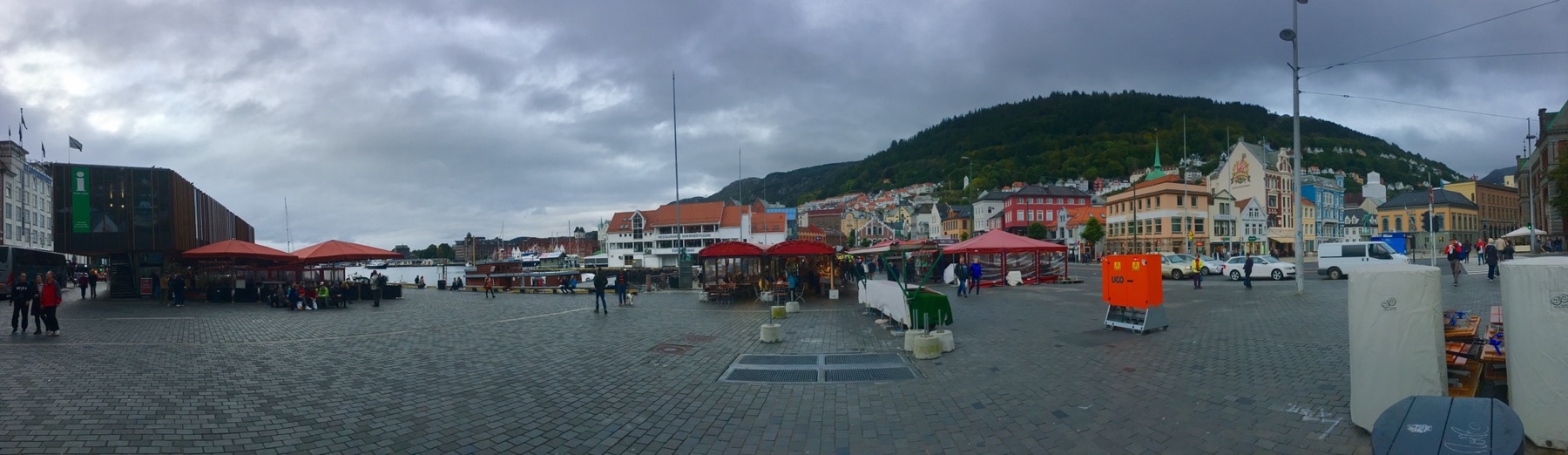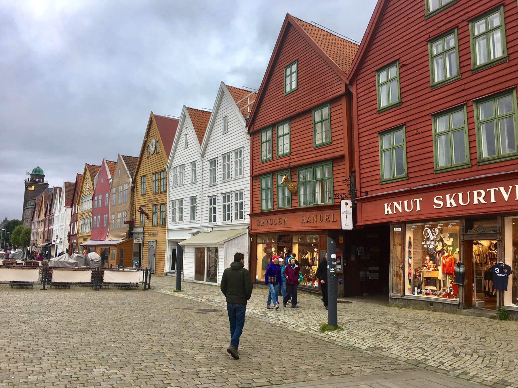 Nous arrivons au port et apercevons de l’autre côté du quai les célèbres maisons de Bryggen. Tout ce quartier a brûlé à de nombreuses reprises notamment en 1476, en 1702 et aussi en 1955. A la suite de ce dernier incendie, la soixantaine de maisons subsistantes fut restaurée dans un style proche du plan médiéval original. Tout le quai est ainsi bordé de hautes maisons en bois, serrées les unes contre les autres, ne laissant que d’étroits passages entre elles. Ces superbes bâtisses à pignons constituaient les entrepôts et les logements des célèbres marchands de la Hanse dont je reparlerai plus tard. Tout ça pour dire que Bryggen est inscrit au Patrimoine mondial de l’Unesco depuis 1979 et on comprend pourquoi !