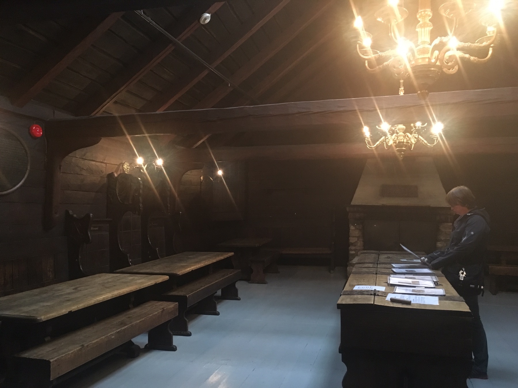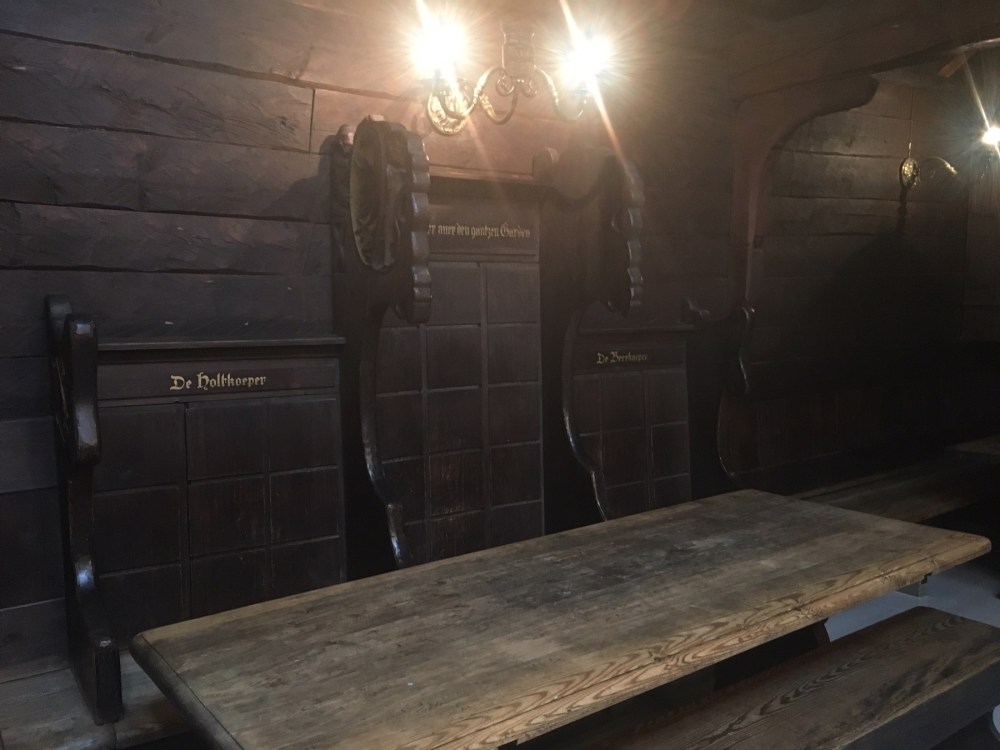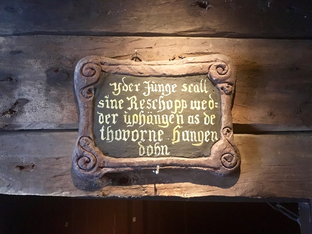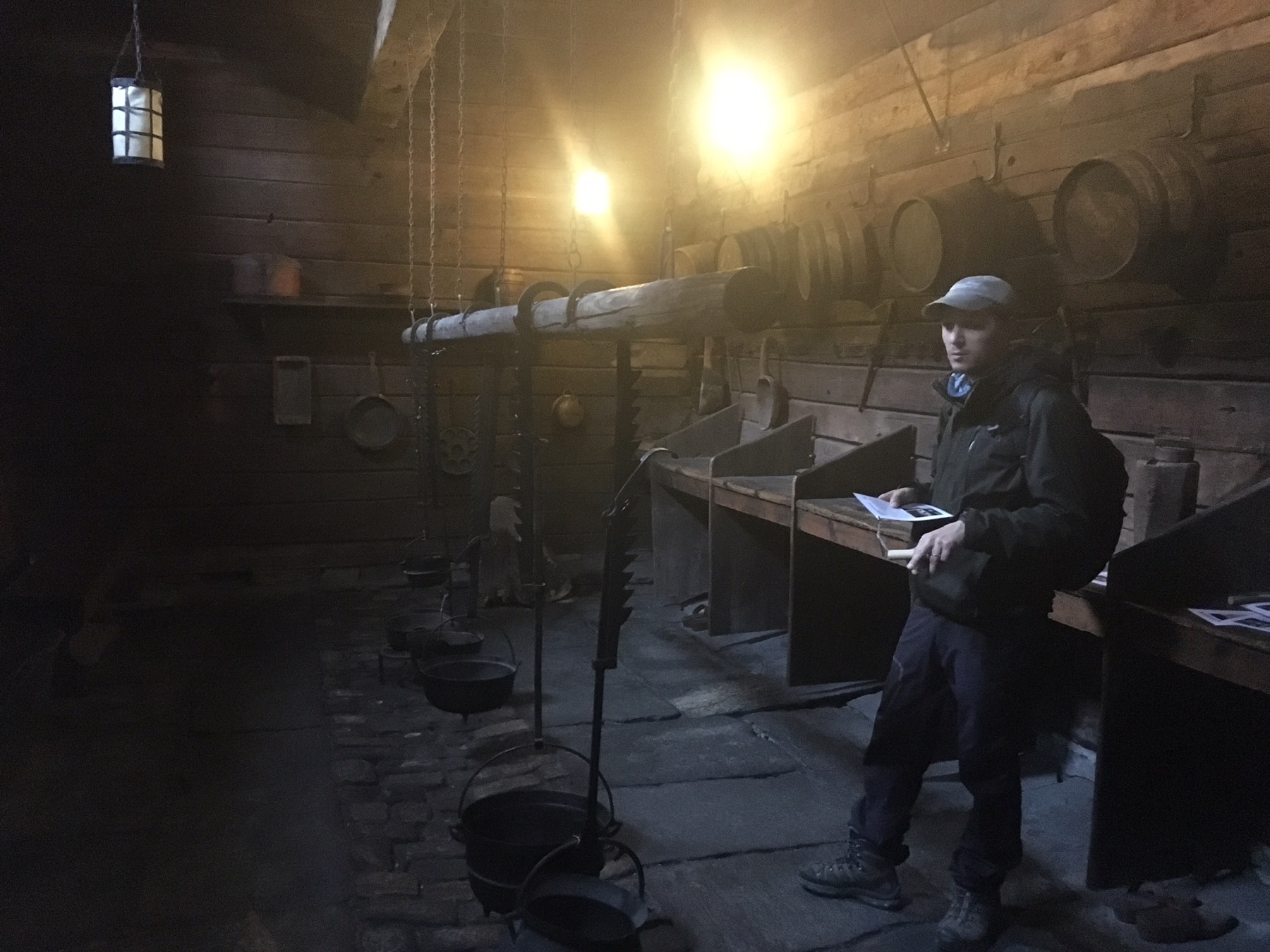 En raison du risque élevé d’incendie, les maisons ne comportaient ni éclairage ni chauffage ni cuisine. Les cuisines se situaient dans d’autres bâtiments, les Schøtstuene, où on trouvait aussi quatre salles communes dans lesquels les grandes réunions et les repas chauds d’hiver étaient organisés. Ce sont les seuls bâtiments de Bryggen où le recours à un feu ouvert était autorisé. C’est également dans ces salles communes qu’était dispensée l’instruction, que siégeait le tribunal et que l’on donnait les fêtes. Pour l’anecdote, un membre de la ligue ayant « malencontreusement » fait un enfant à une habitante de Bergen était jugé et condamné à offrir de la bière à toute la communauté hanséatique ! Pas si pire la punition. Sauf qu’un tonneau de bière pouvait coûter le prix d’une maison à l’époque et que bien souvent c’est le gérant qui devait payer les frais pour son apprenti fauteur… On comprend mieux l’usage d’un lit pour deux apprentis du coup… ça limitait peut être les dégâts !