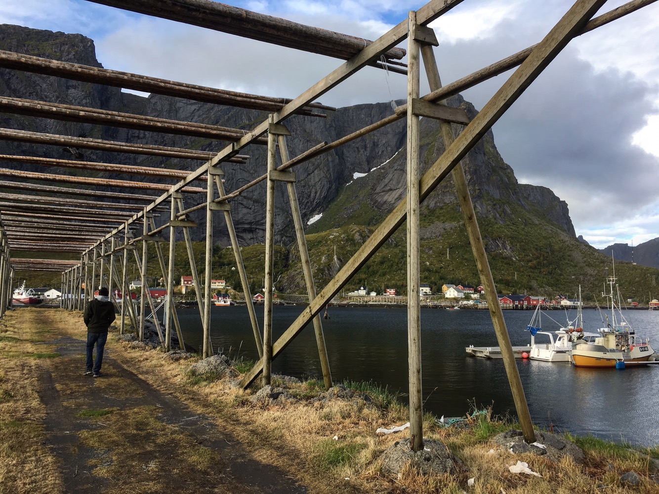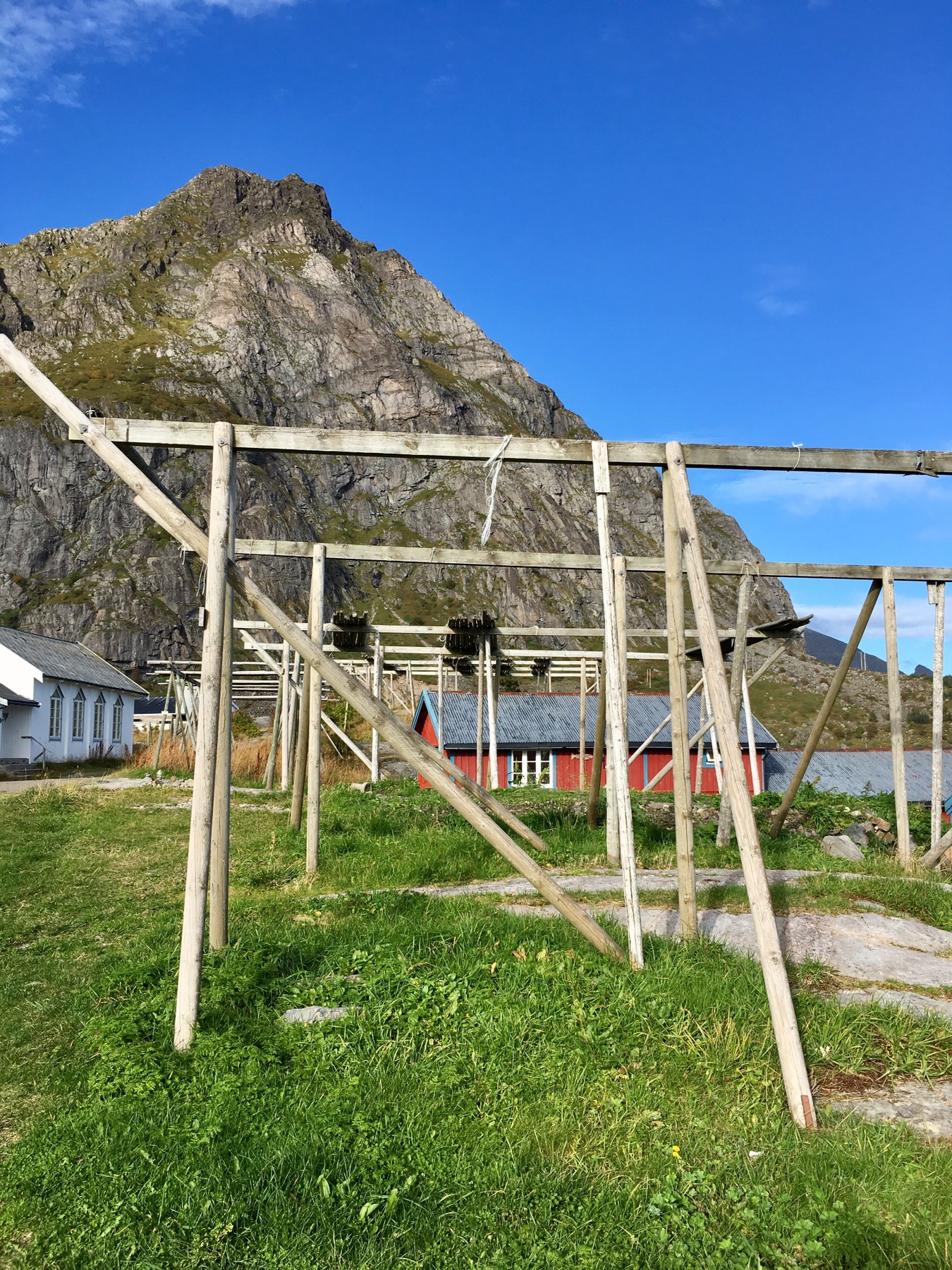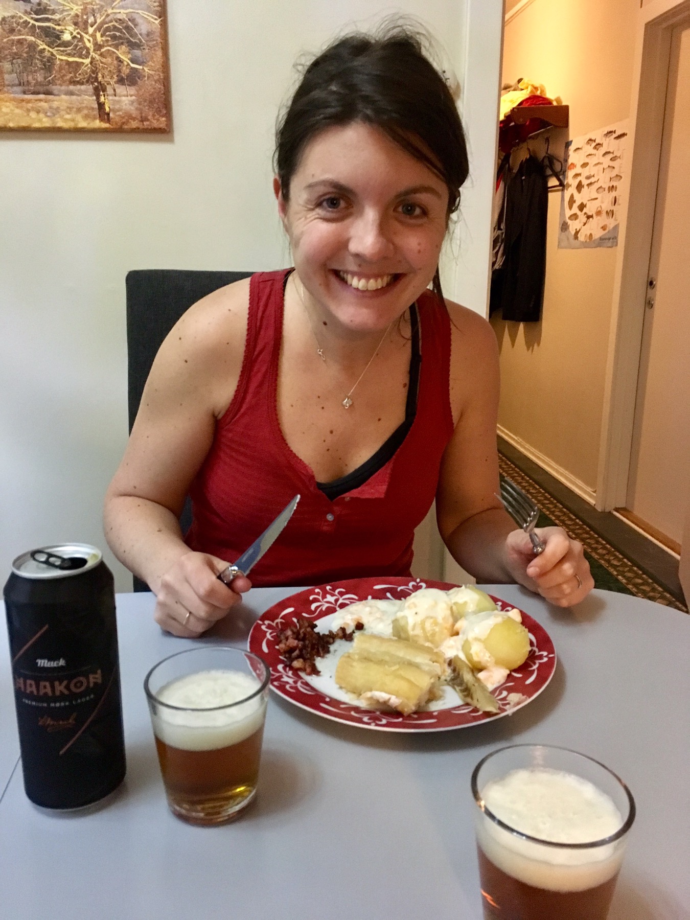Retour maison, Roy nous a préparé de la morue qu’il a pêchée et faite sécher deux semaines au vent des Lofoten. Un délice, accompagné de pommes de terre, carottes à la crème et… bacon !