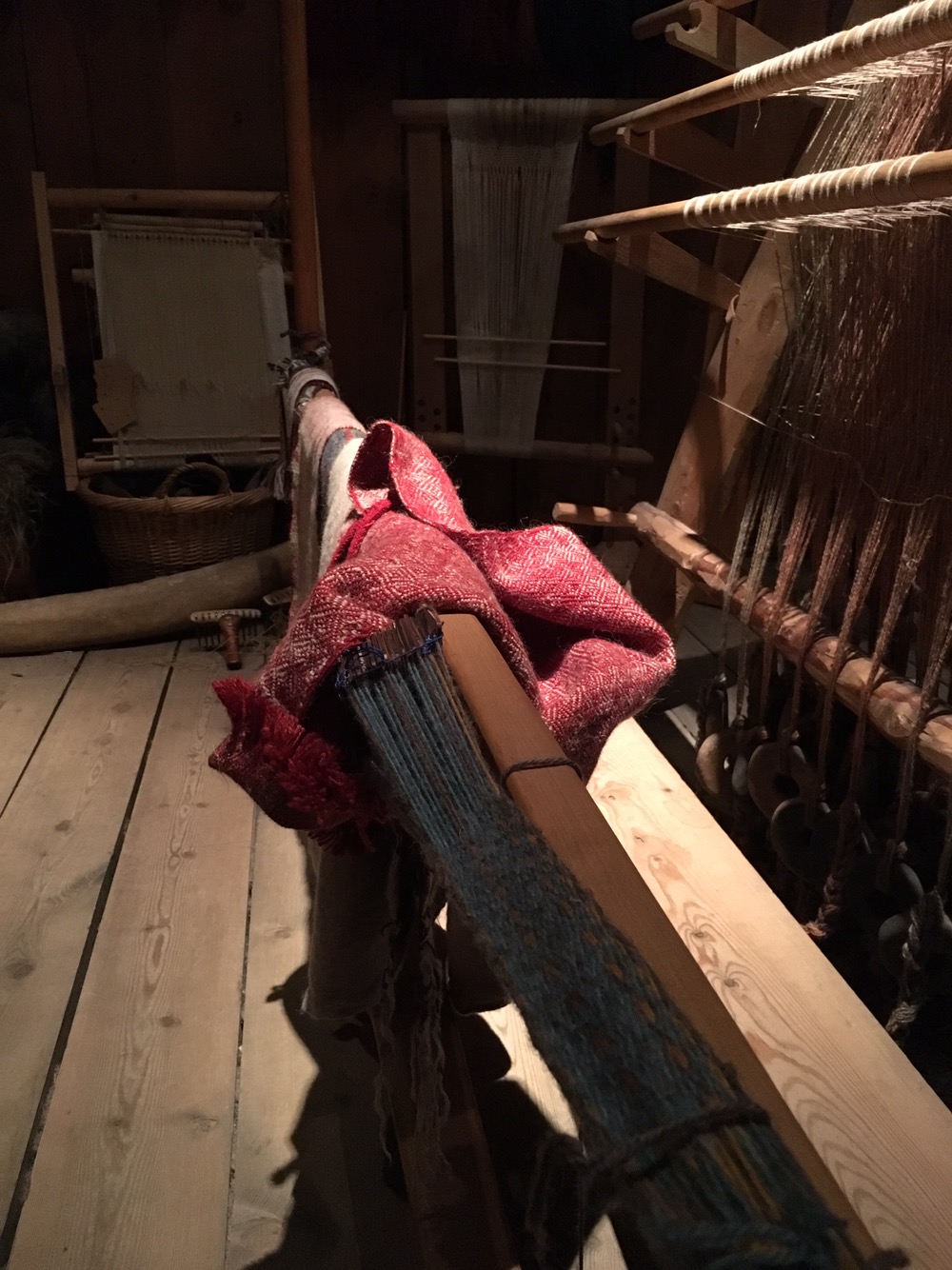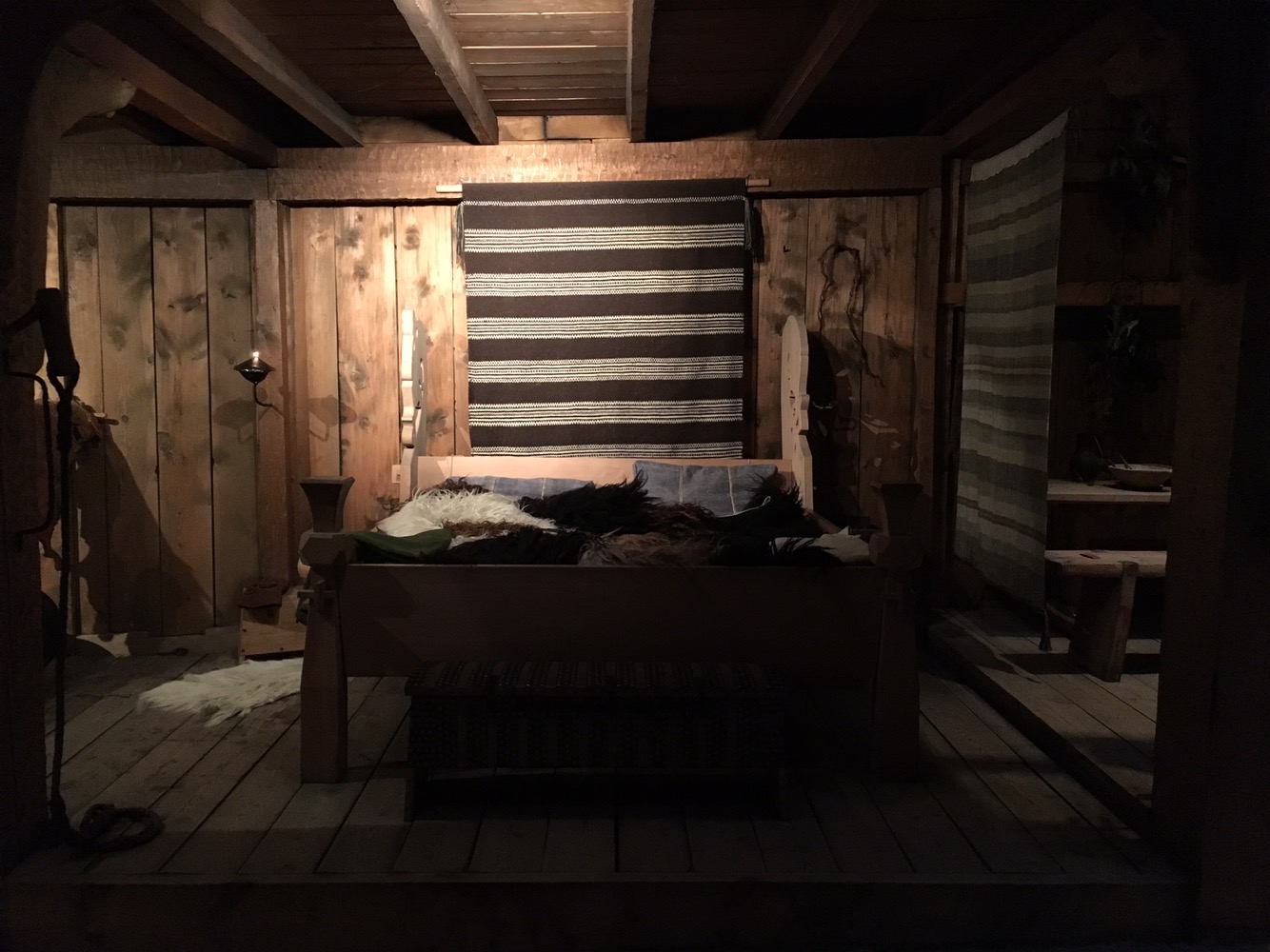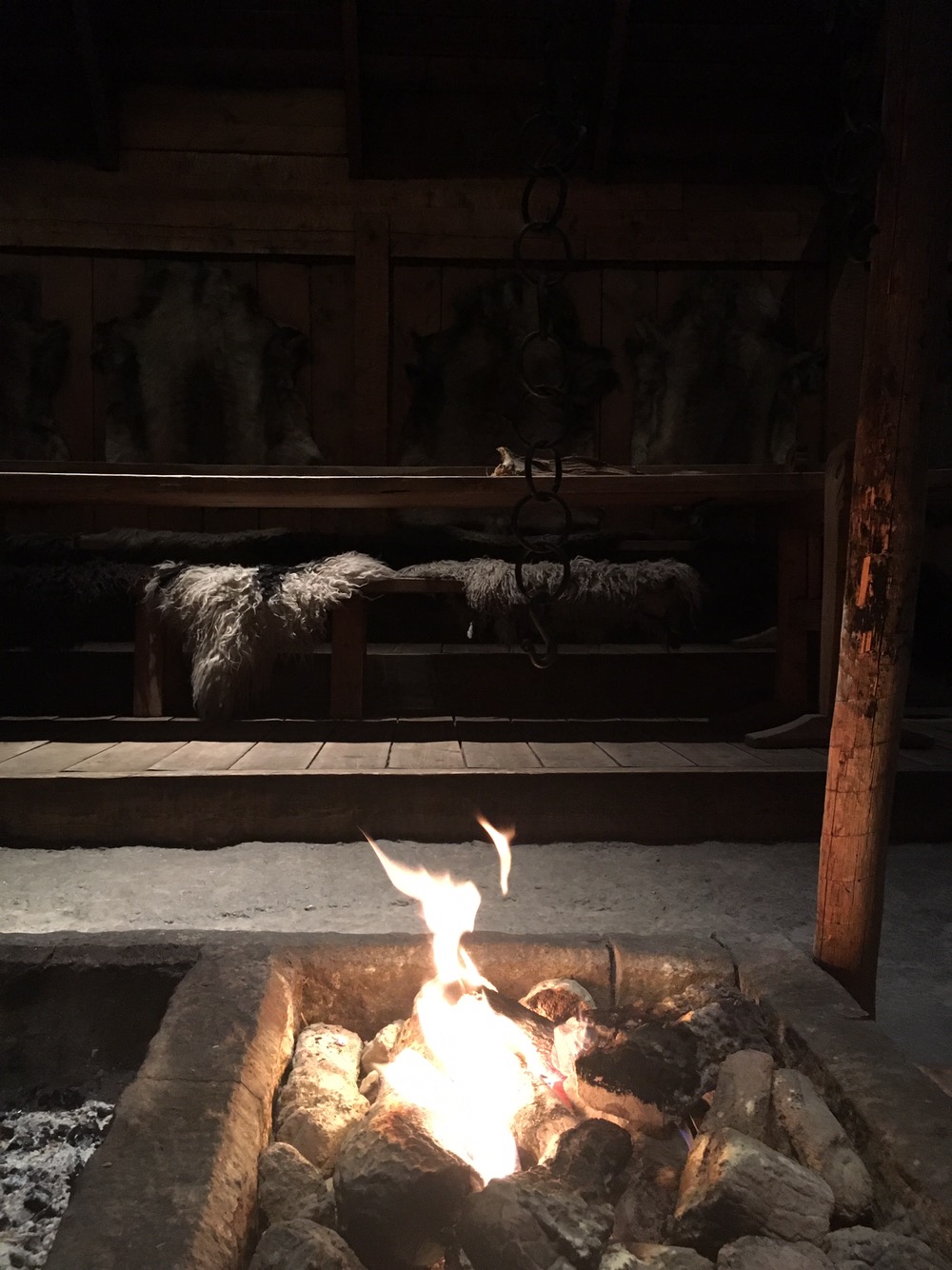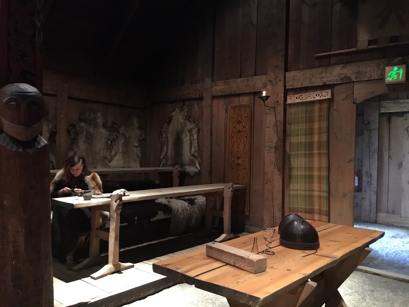 La maison en question ! 83m de long pour 9m de haut ! Il s’agit en fait de la réplique de la plus grande demeure d’un chef viking jamais découverte, le chef Olaf ! Ce sont des paysans locaux qui en ont découvert les vestiges il y a un peu plus de 20ans complètement par hasard. Toute la communauté locale s’est alors réunie et les plus grands archéologues du monde entier ont commencé à débarquer pour étudier le site, habité entre 500 et 900 après JC. Il a alors été décidé de la reconstruire à l’identique, juste en face des fouilles, et de faire appel à tous les artisans locaux et d’ailleurs pour créer les tissus, les meubles, la vaisselle, la décoration pour en aménager l’intérieur. Vingt ans plus tard, les projets de création continuent de se développer in situ et la maison est aménagée du sol au plafond ! Comme si nous y étions vraiment, il y a 1500 ans ! Un travail remarquable !